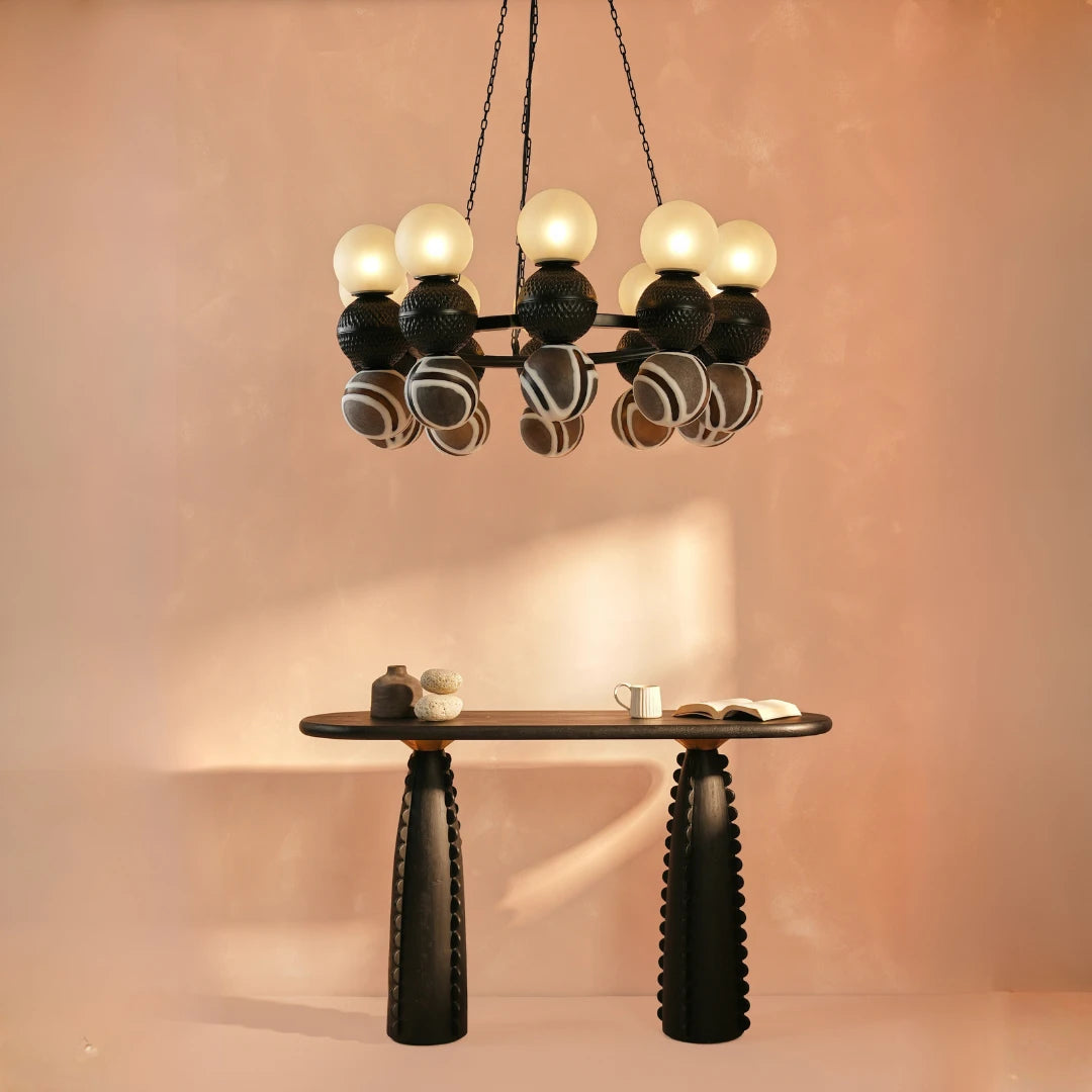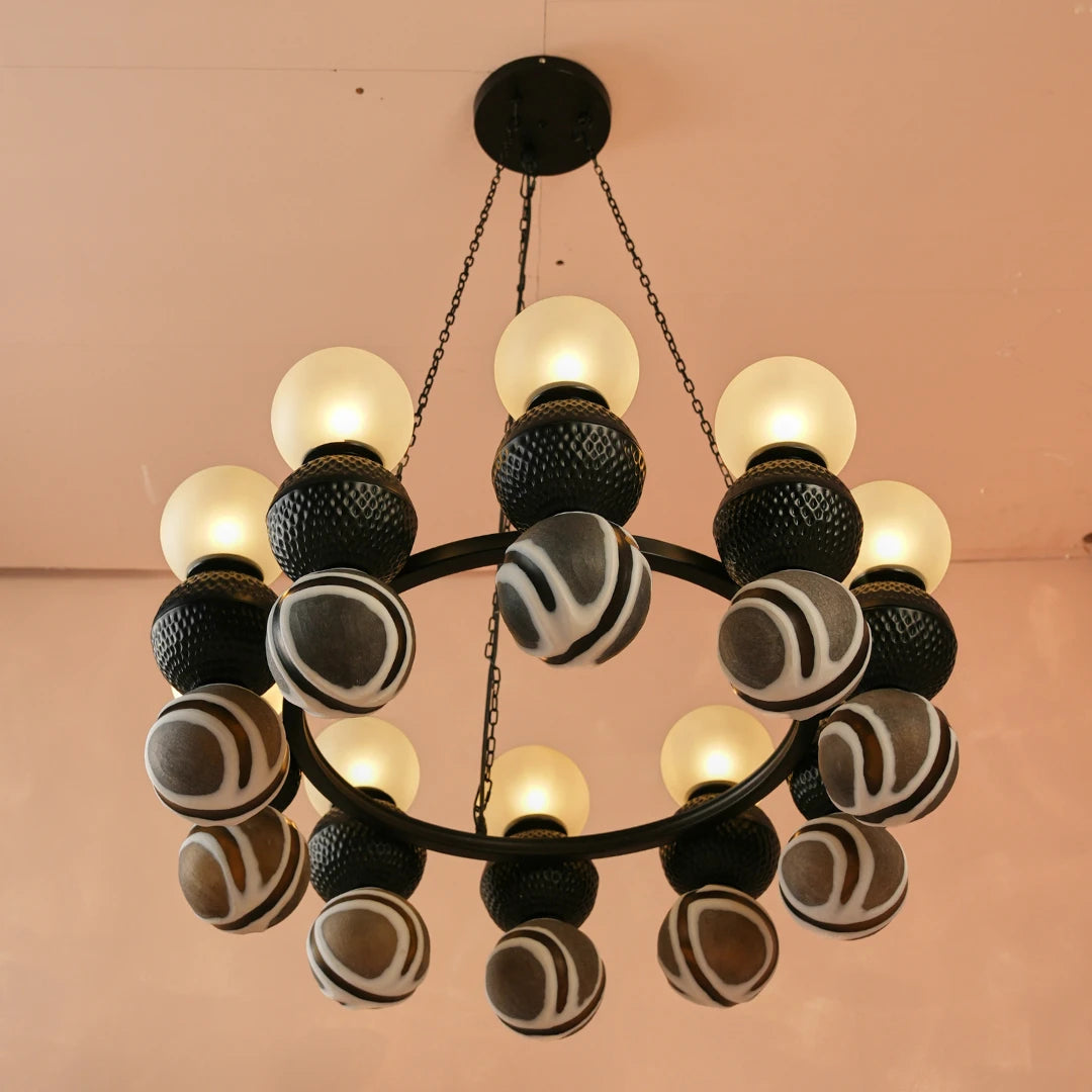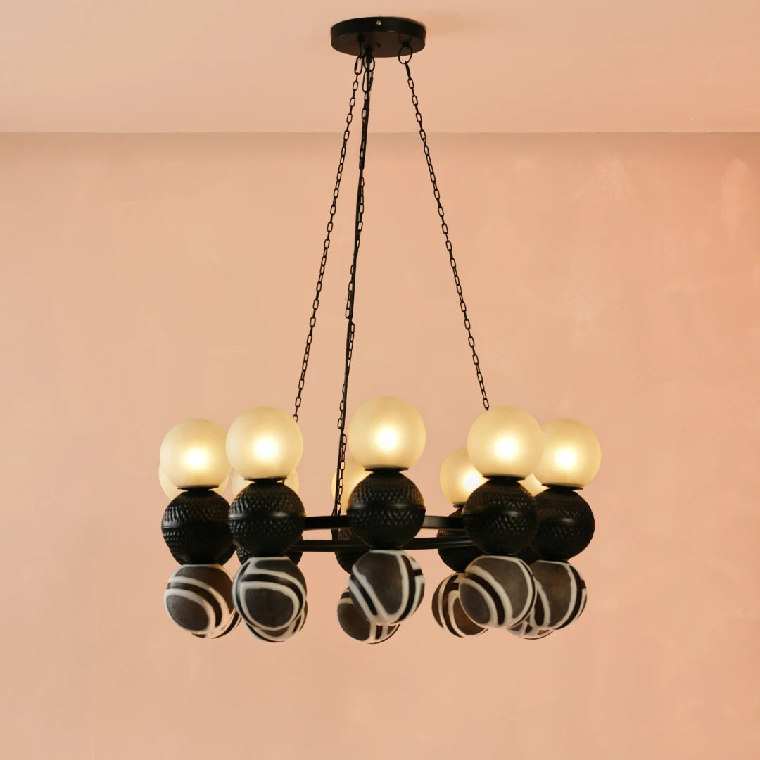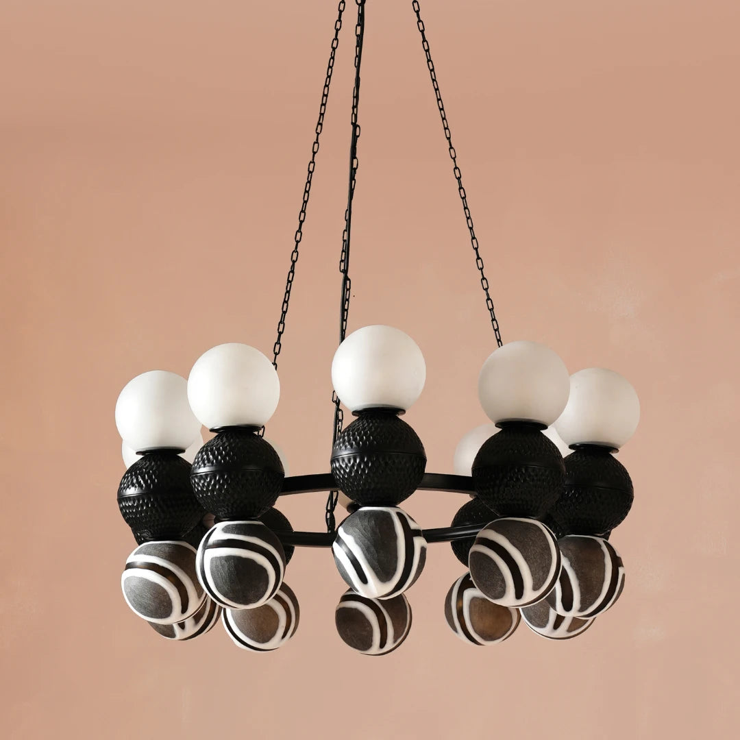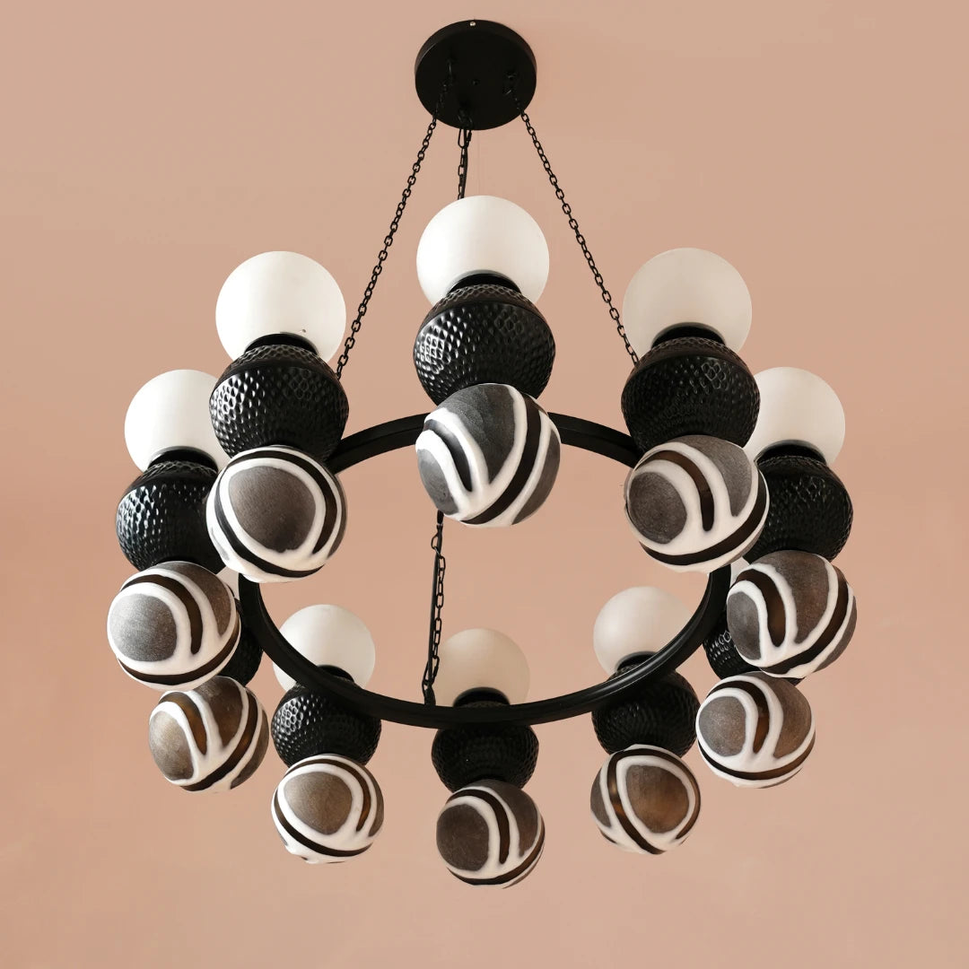 Expansive yet refined, the Lagori Large Chandelier magnifies the poetry of alignment. Layers of black-and-white double-cast glass cradle frosted orbs in sculptural precision. Its generous scale draws the eye upward, a dance of structure and spontaneity. A bold anchor for grand spaces.