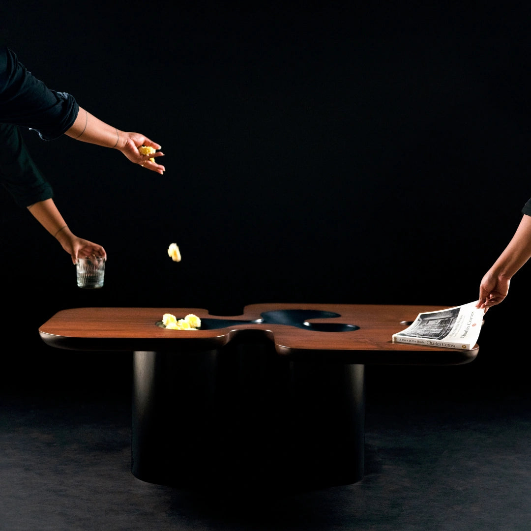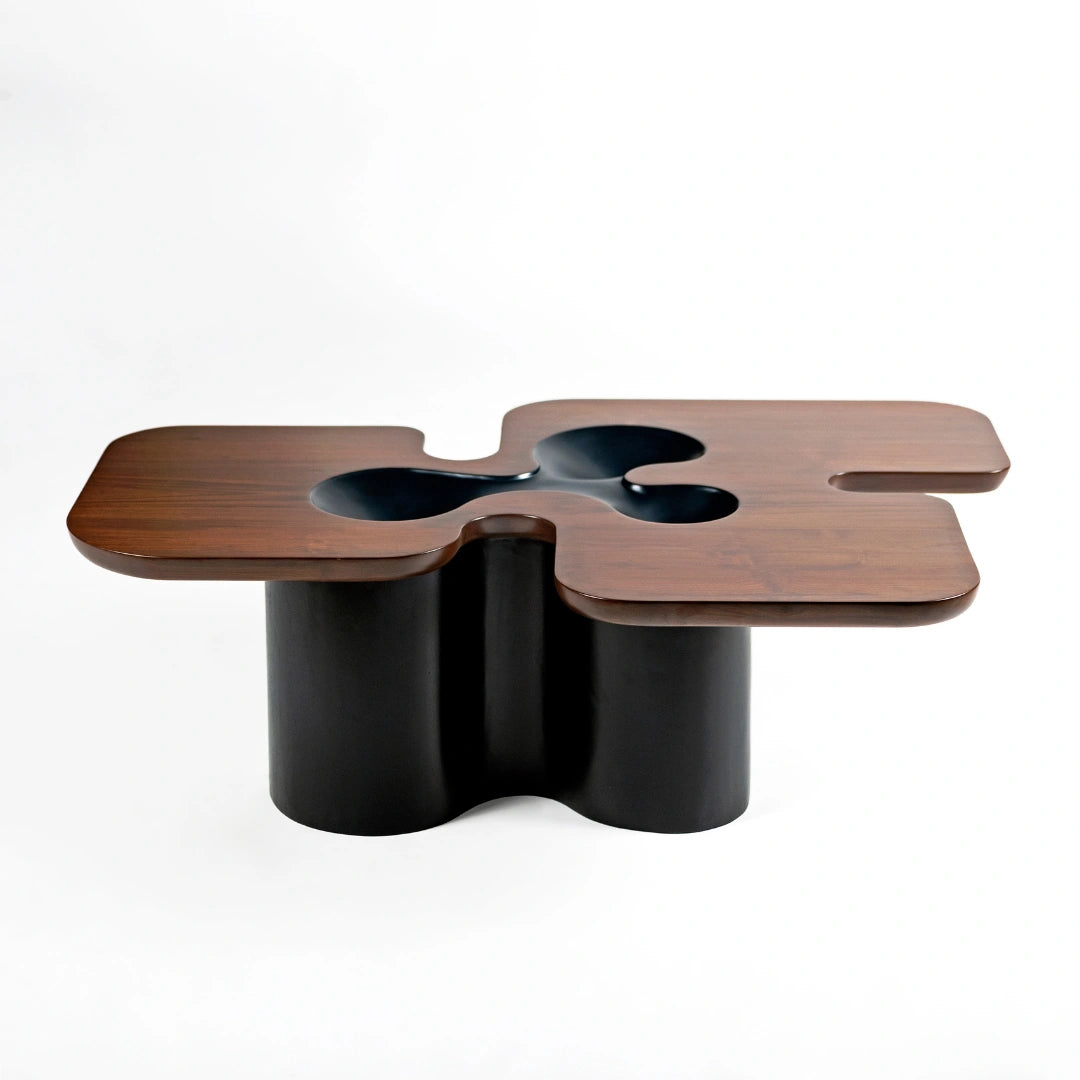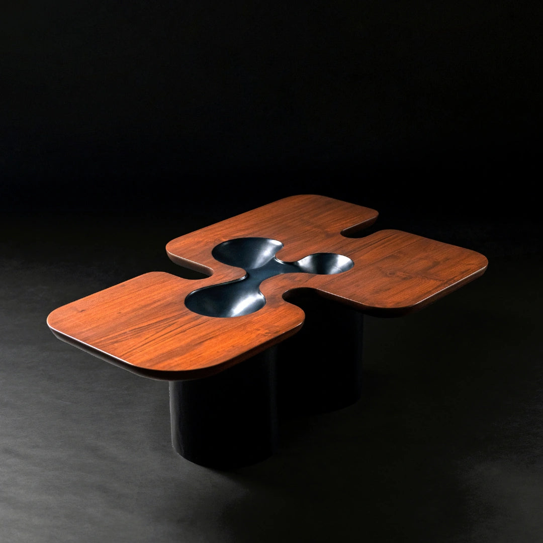 The Canyon Centre Table explores the balance between mass and lightness. Carved bowl-like depressions punctuate the surface, giving the table its distinctive identity. Anchored by a solid central base, the top appears to gently float, creating a form that feels voluminous yet light. Finished in dual tones, the carved details are subtly accentuated, inviting both touch and use.