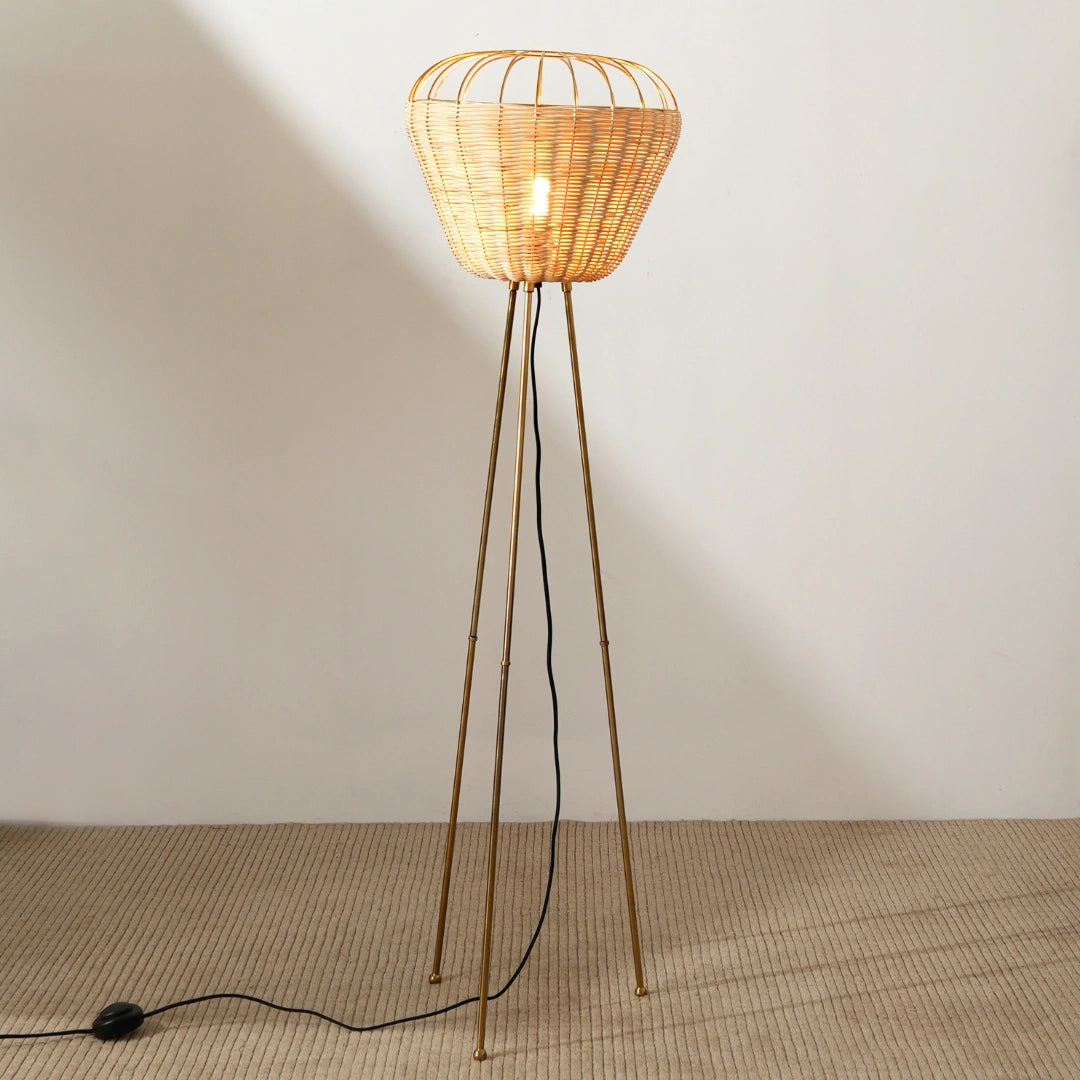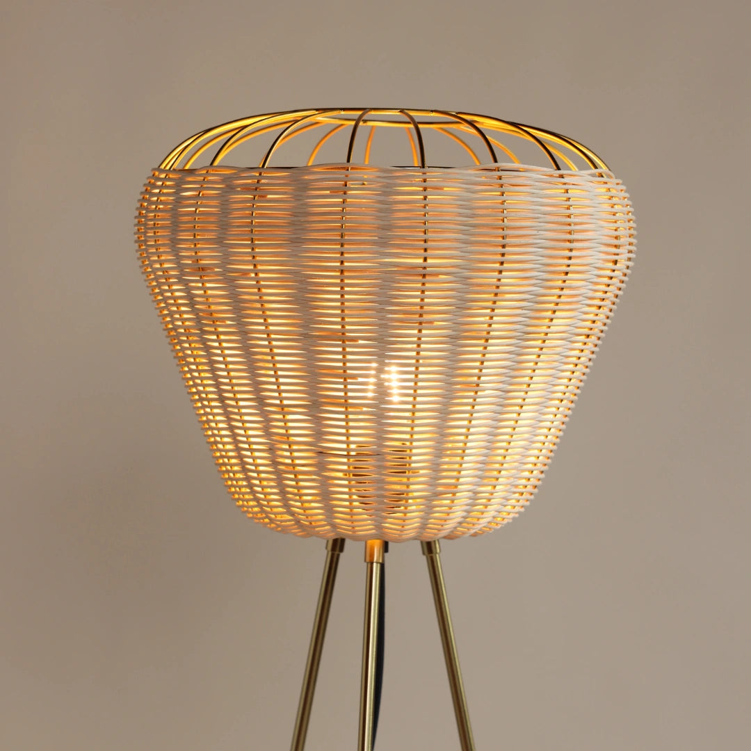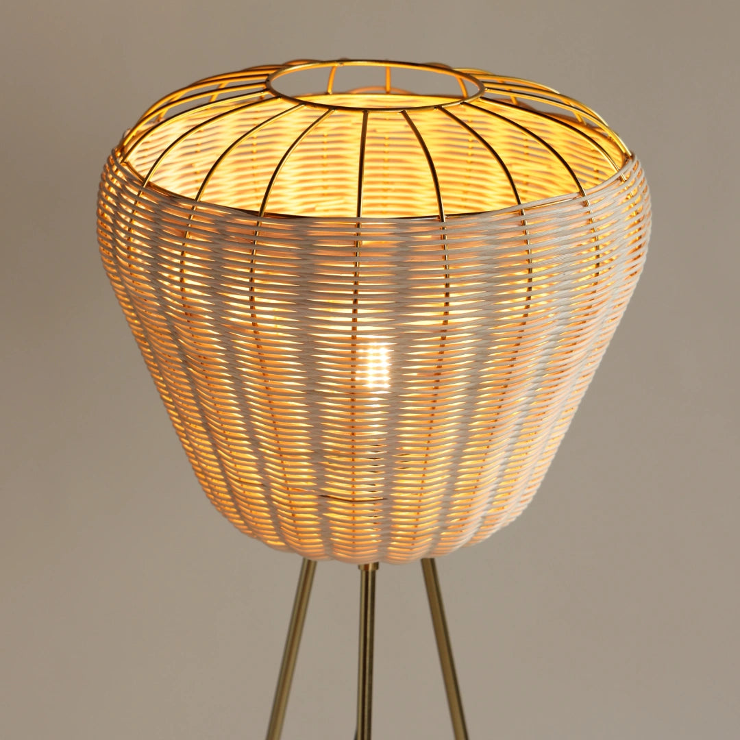 • Sculptural Basket Silhouette – Features a handwoven rattan shade with a wide, rounded form perched on sleek, tripod-style metal legs.