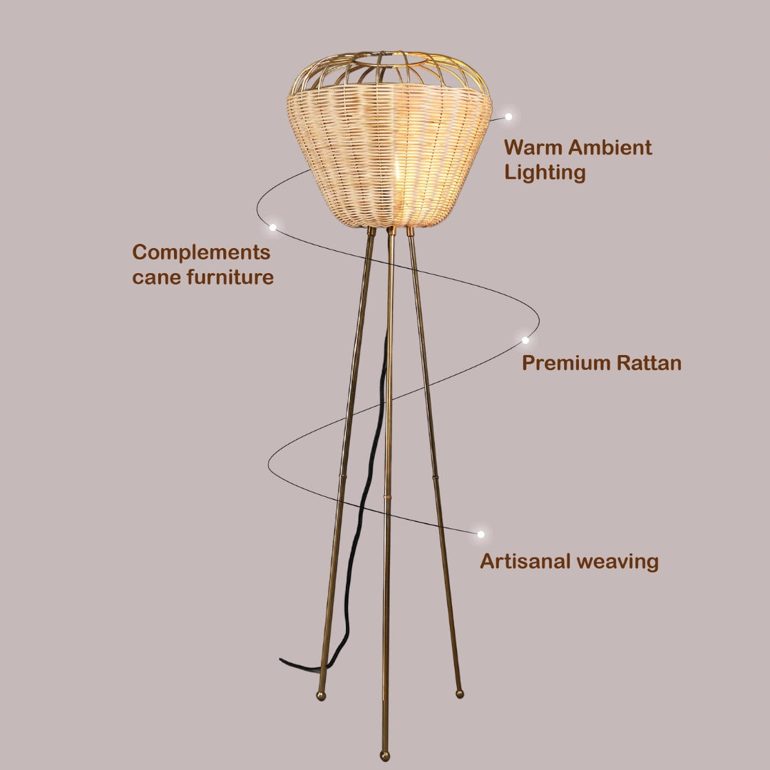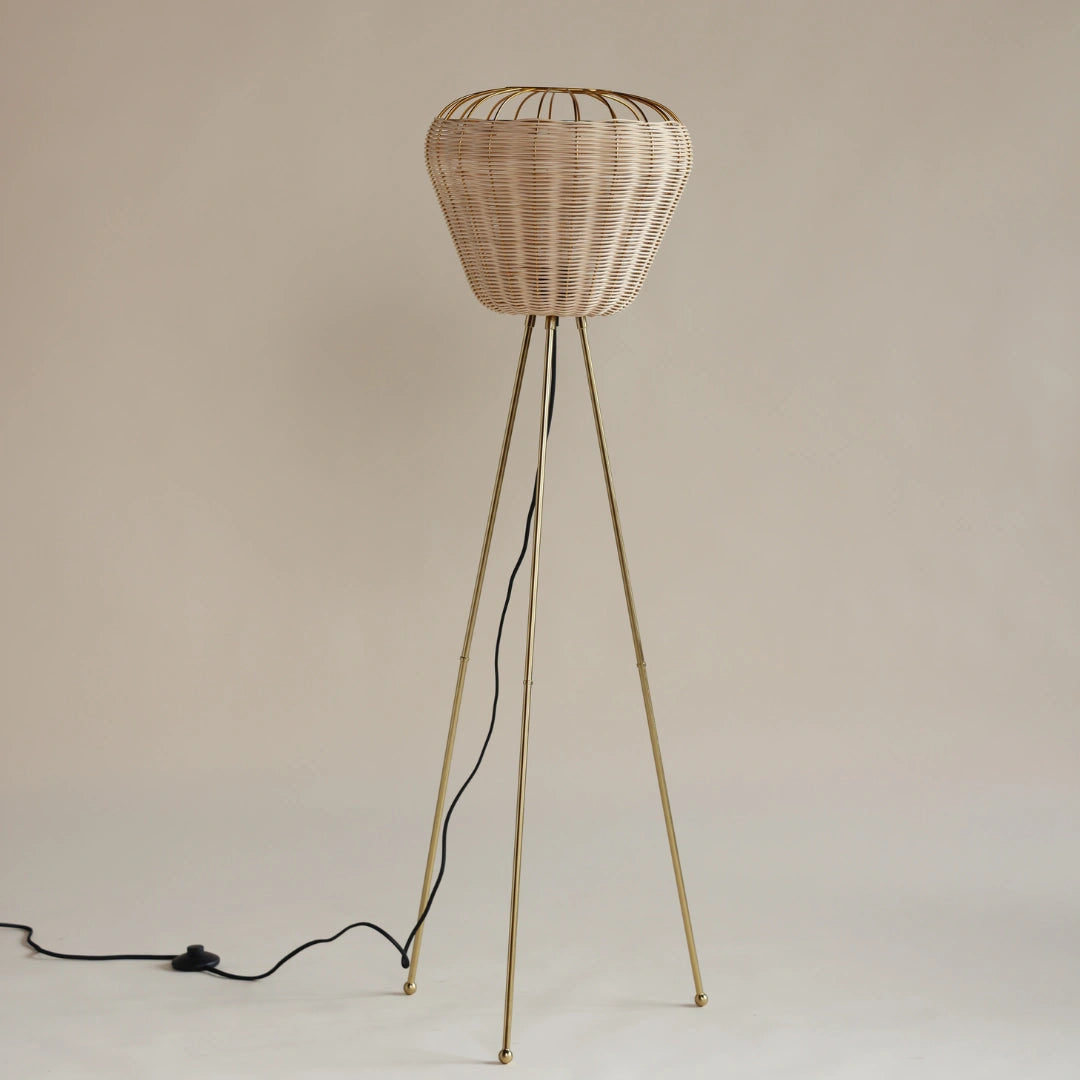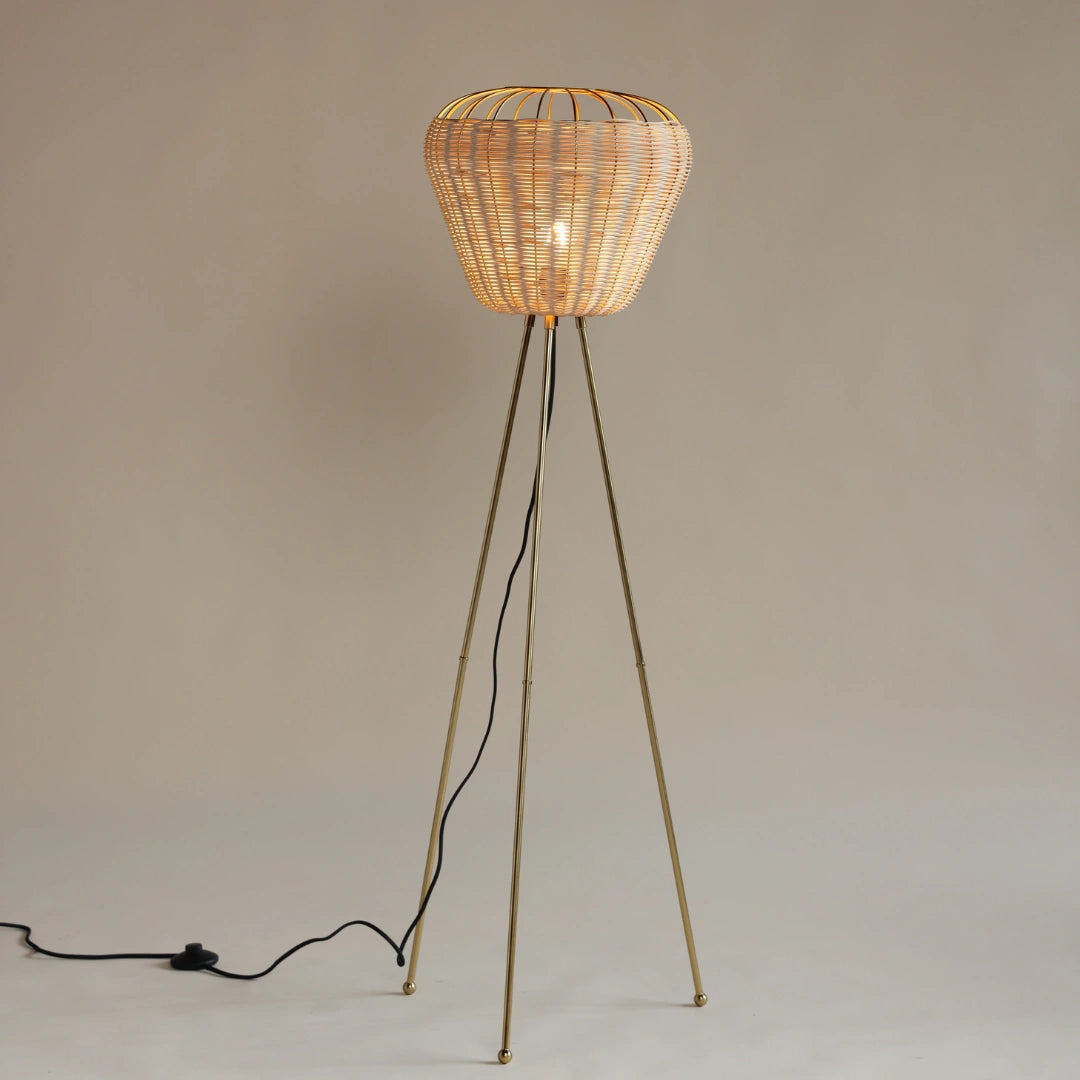 • Sculptural Basket Silhouette – Features a handwoven rattan shade with a wide, rounded form perched on sleek, tripod-style metal legs.