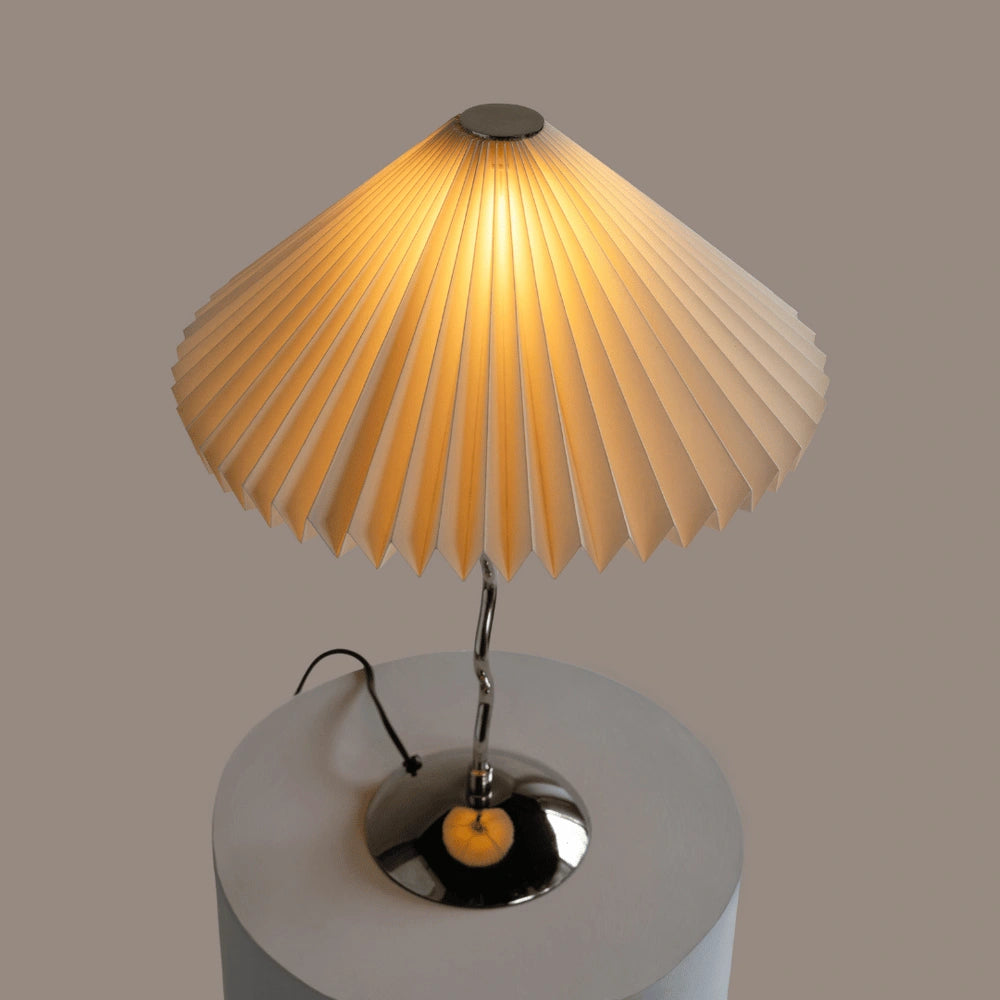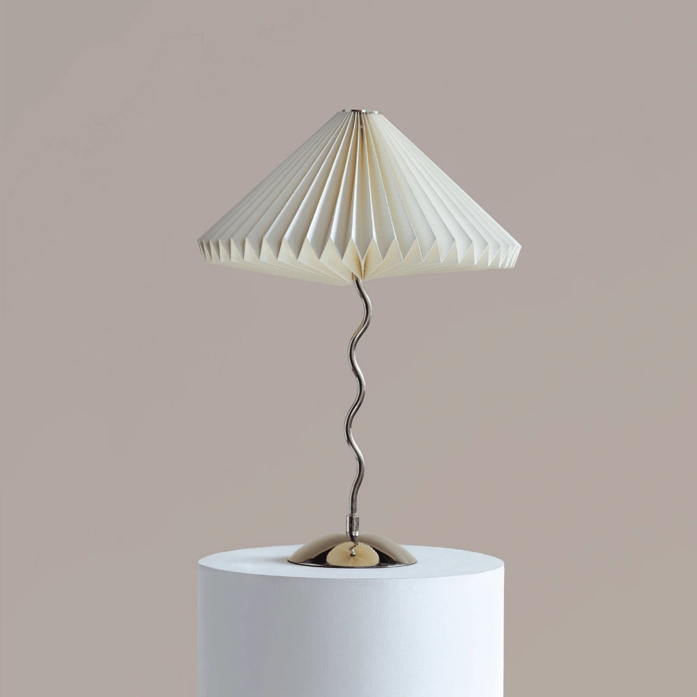 1)  Handcrafted table lamp with a serpentine design, featuring a handpleated paper shade and a powder-coated metal base for timeless elegance.