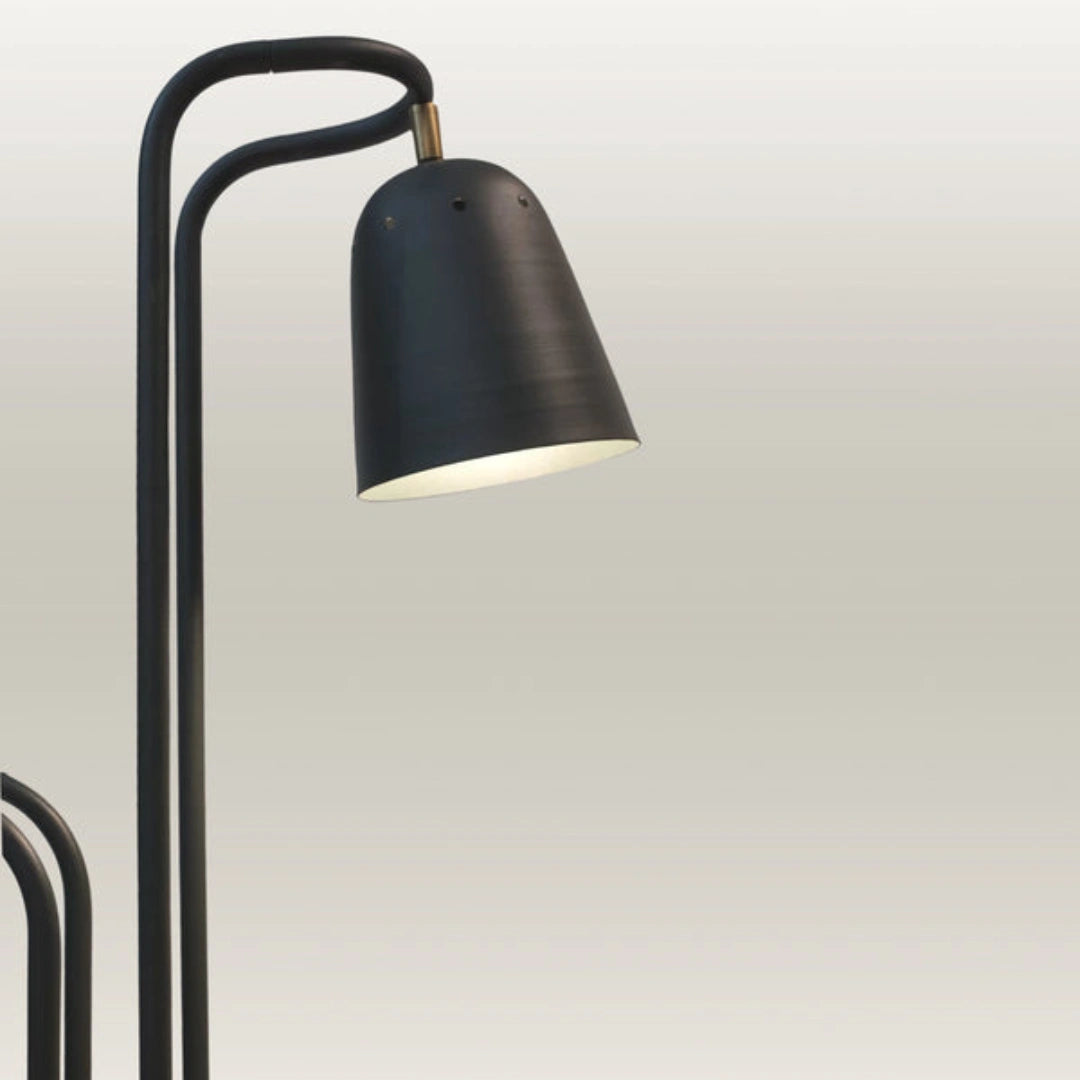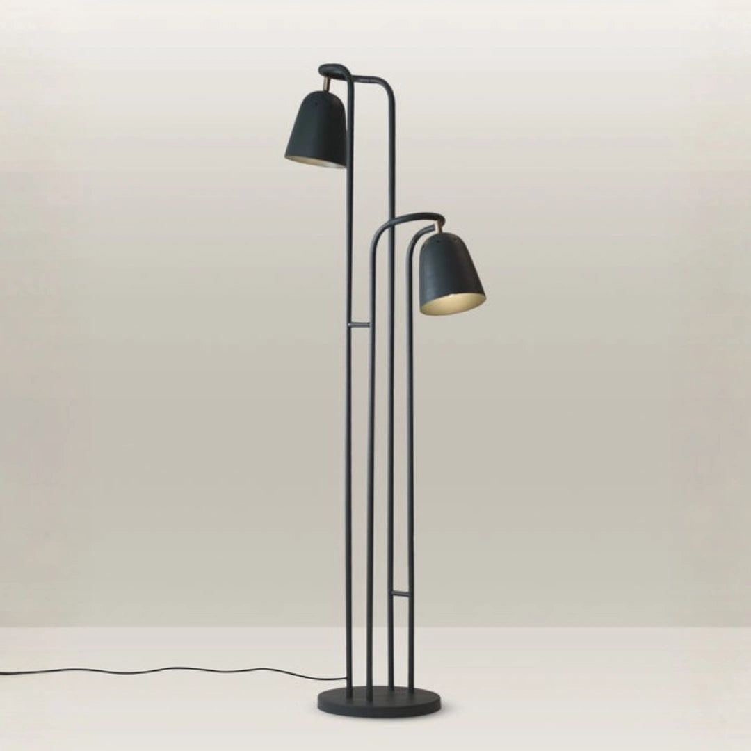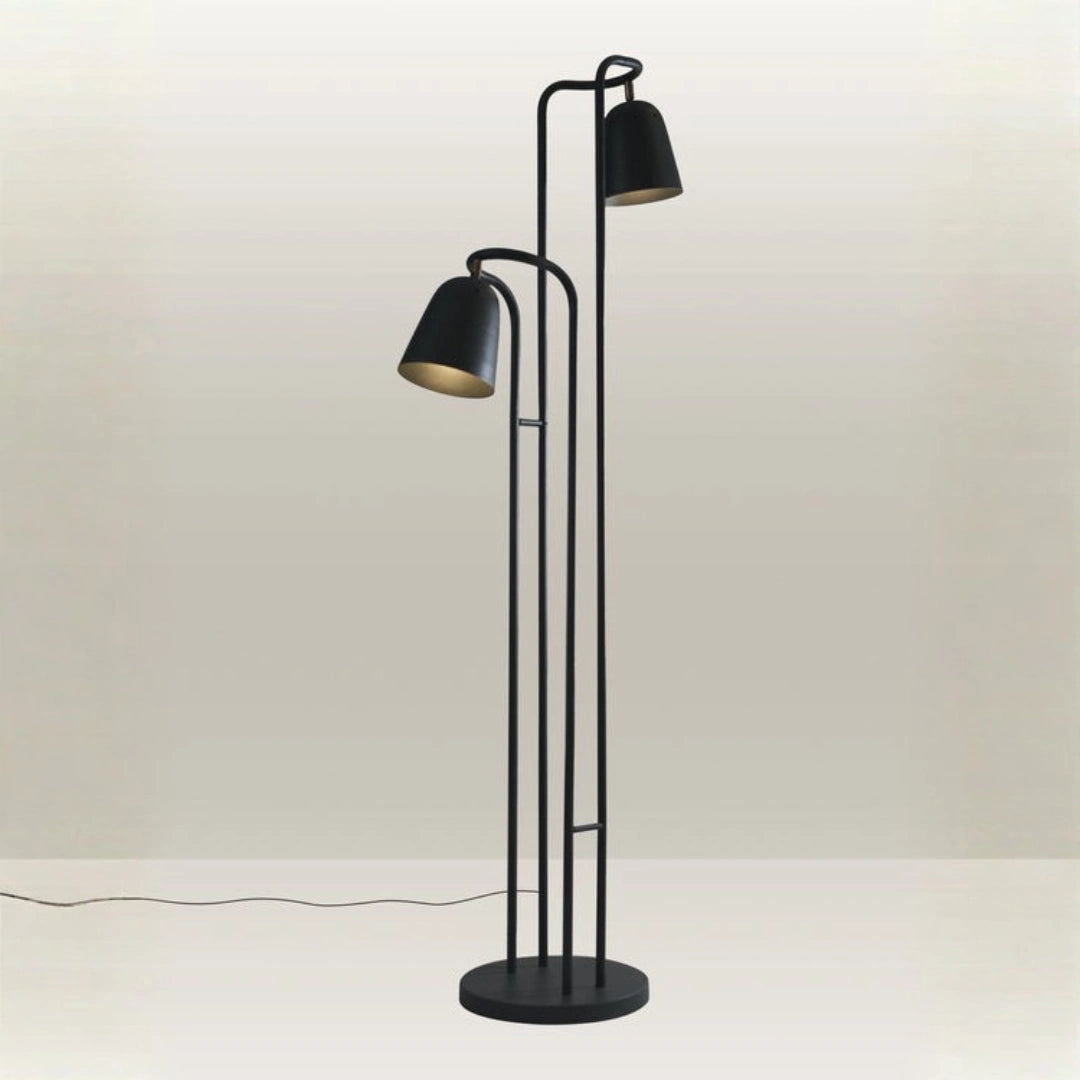 The lamp features a sleek, minimalist design with two adjustable heads, each encased in a matte black finish. The dual-head configuration allows for versatile lighting options, providing both ambient and task lighting to suit any setting. The sturdy base ensures stability, while the slender, gracefully curved stems add a touch of modern artistry to any room.
