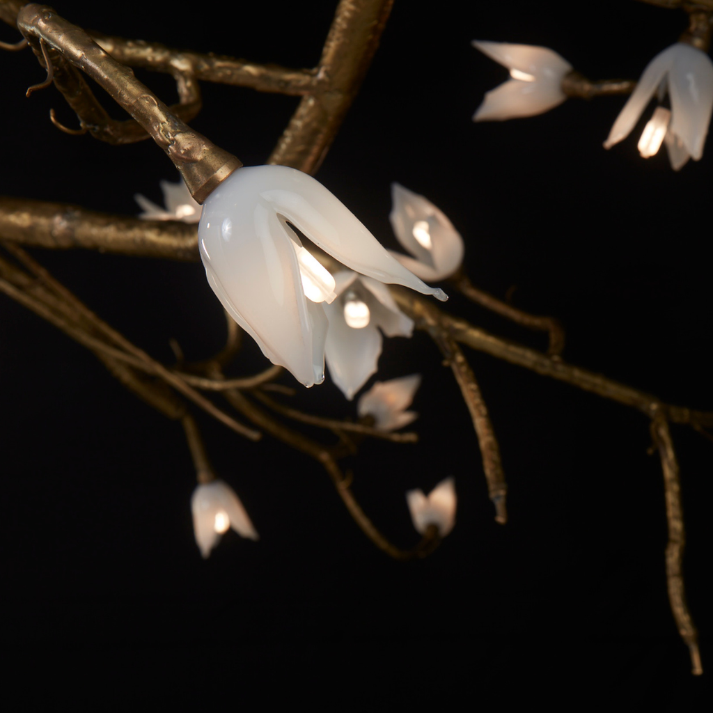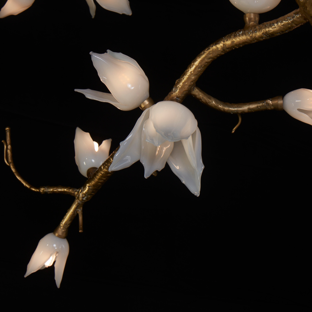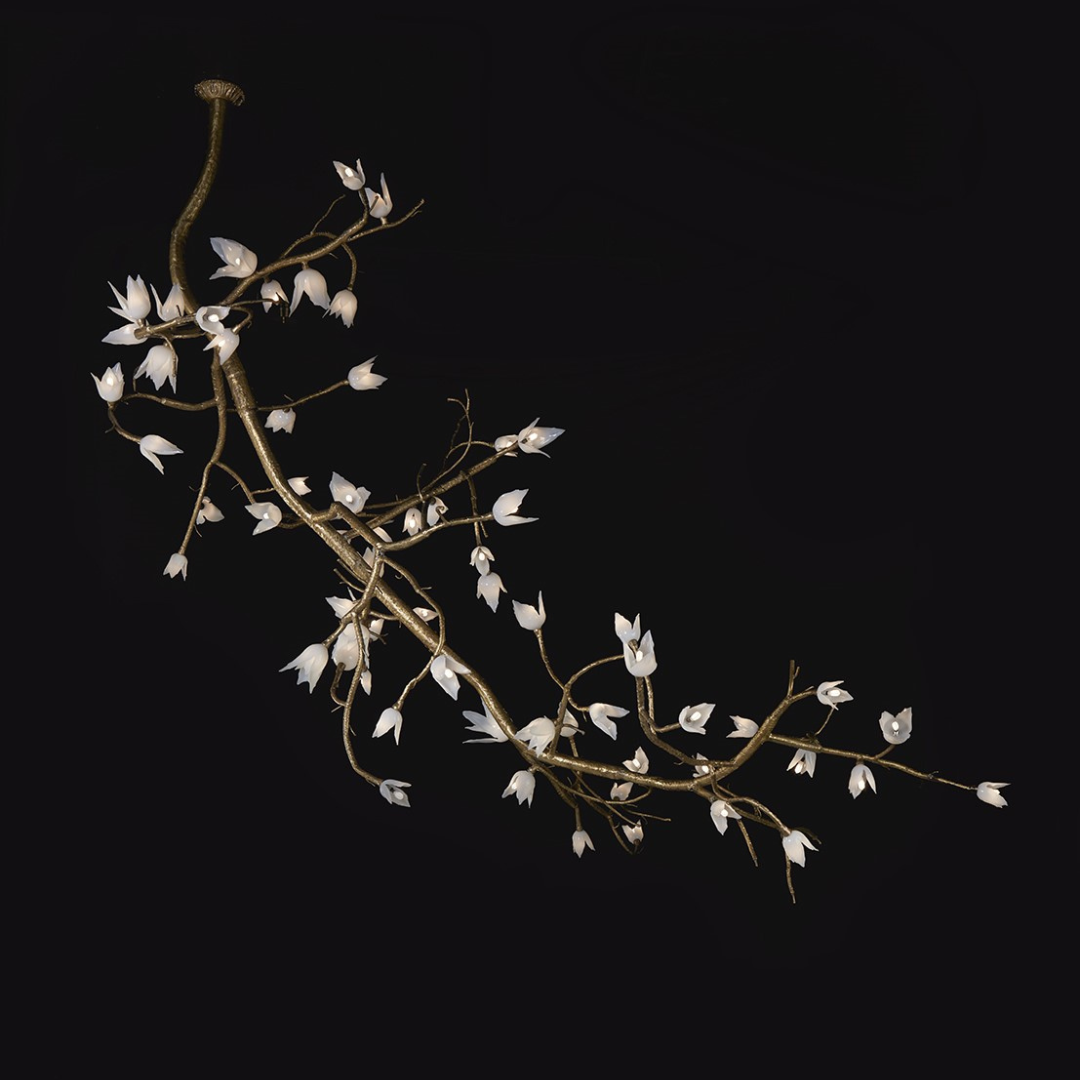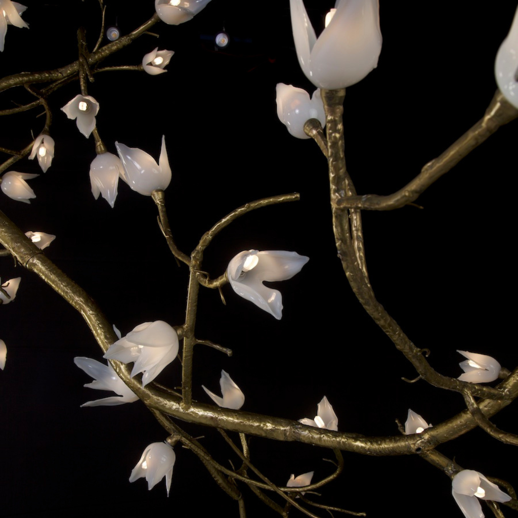 Illumination emerges through a unique embodiment, comprising 100 separate white petals and an intricately twisted branch that spans 7 feet in length, 3 feet in width, and 6 feet in height. Adorned with meticulously crafted hand-blown glass flowers and intricate textured brass, its purpose is to bring the essence of nature into our immediate environment. This captivating sculpture symbolizes the emergence of fresh start and bringing hope.