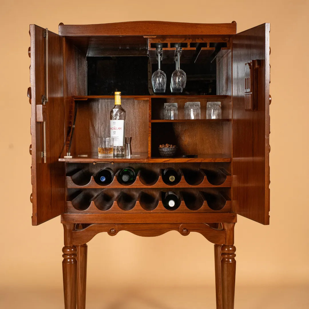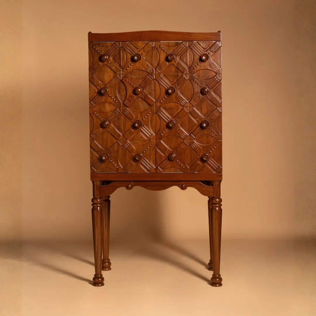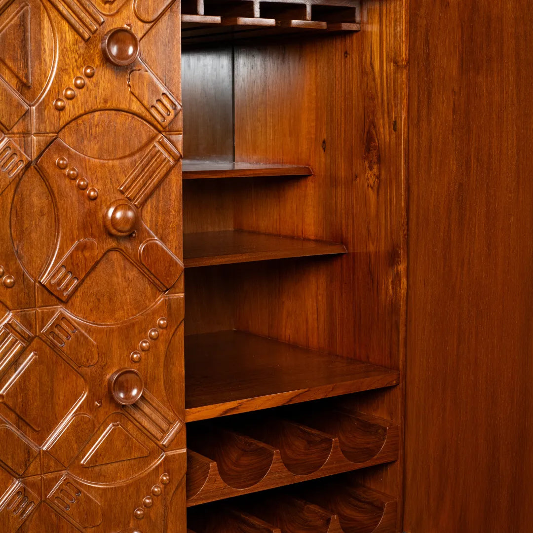 Tresse is a whimsical bar cabinet designed as a modern-day Pandora’s box. Its patterned facade hides a playful two-step opening mechanism, making interaction part of the experience. Crafted through CNC carving, hand carving, and turning, the unit celebrates wood in all its forms while offering optimized storage for every bar essential. A true blend of craft, detail, and delight.