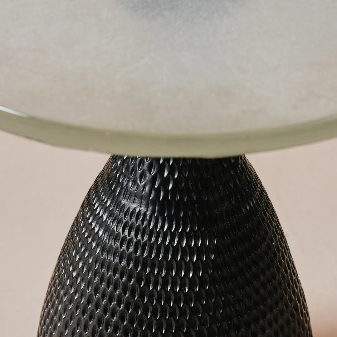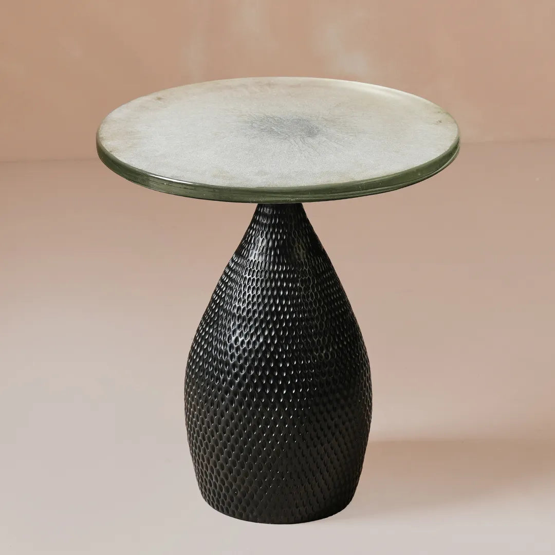 Compact yet striking, this table brings repoussé artistry to everyday living. Glass and mild steel unite in black-finished strength. The textured surface catches light like quiet ripples. Small in scale, powerful in presence.