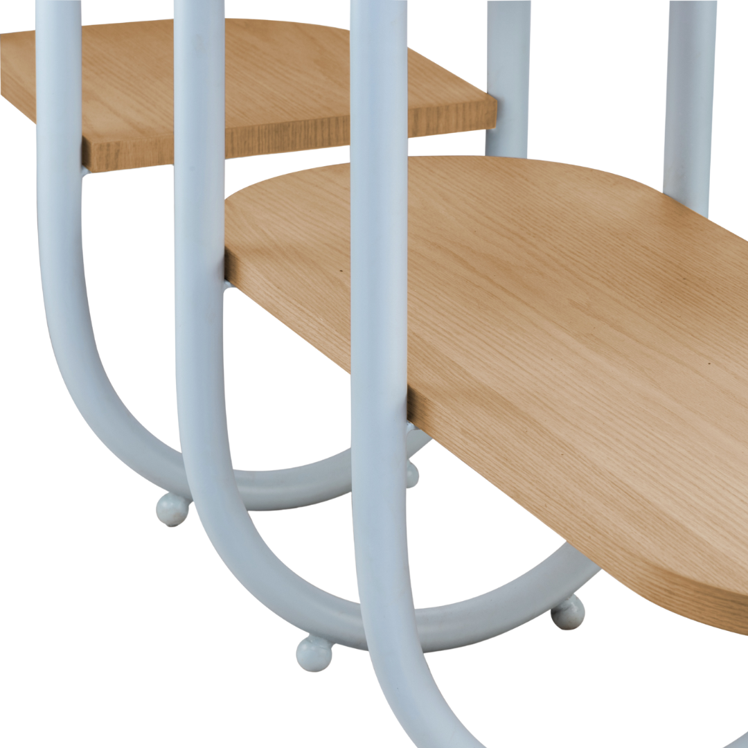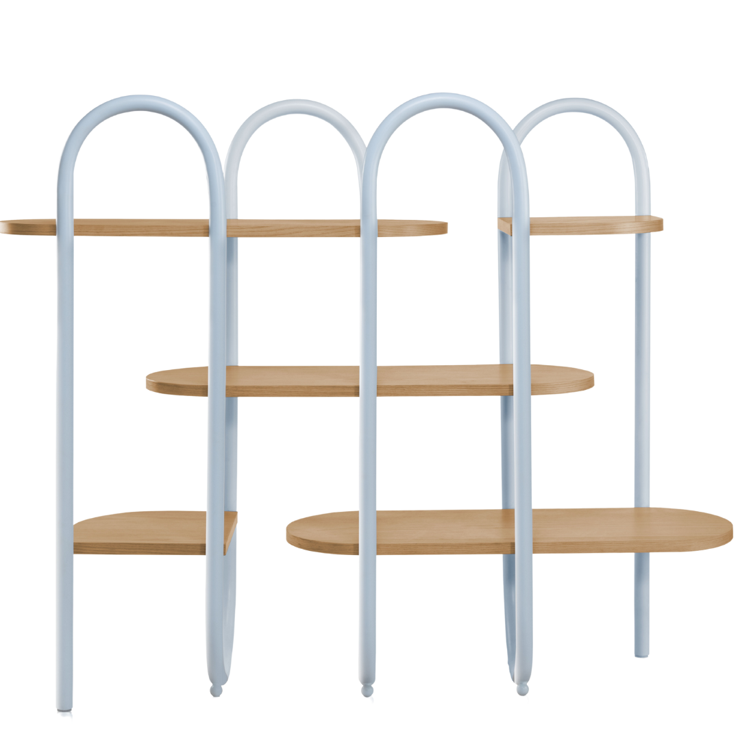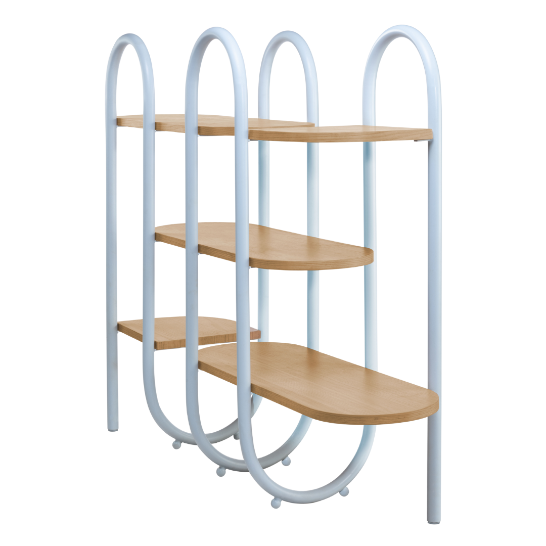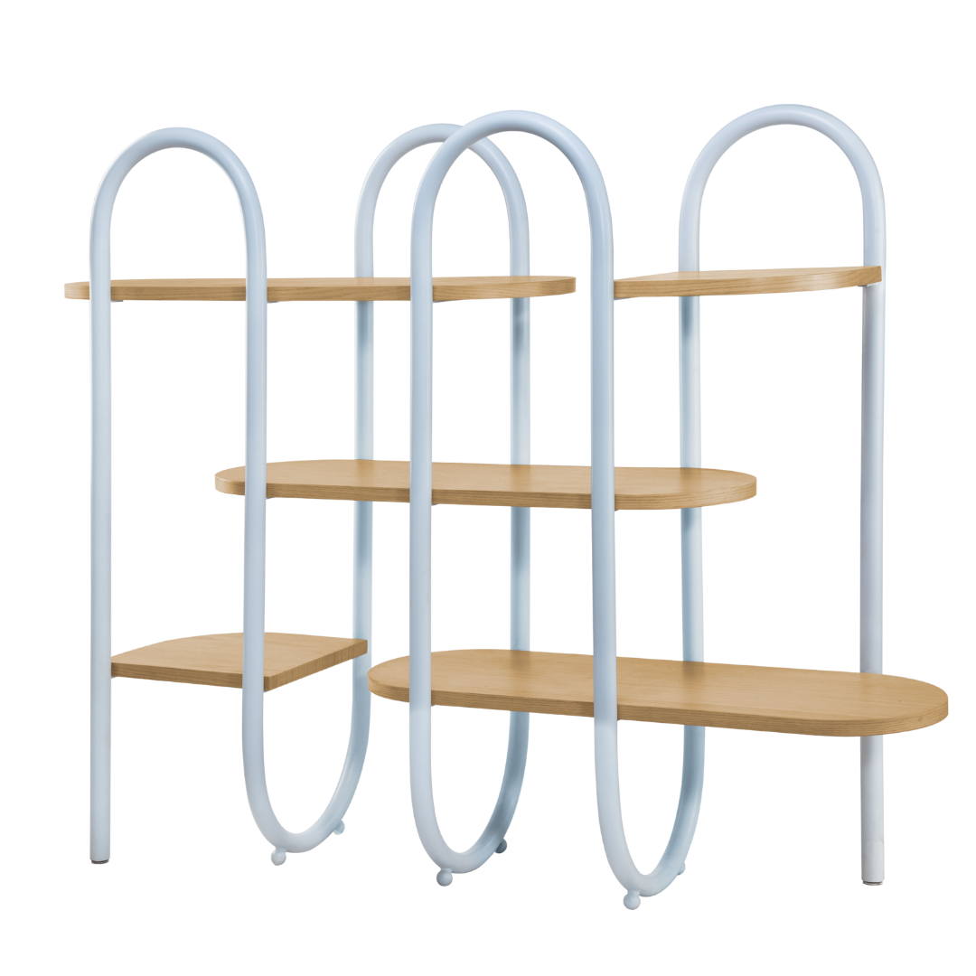 A unique shelf designed as a continuous line made in metal that holds the wooden planks together. A functional and minimal design that can be used as storage or just to divide your space.