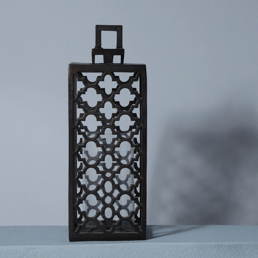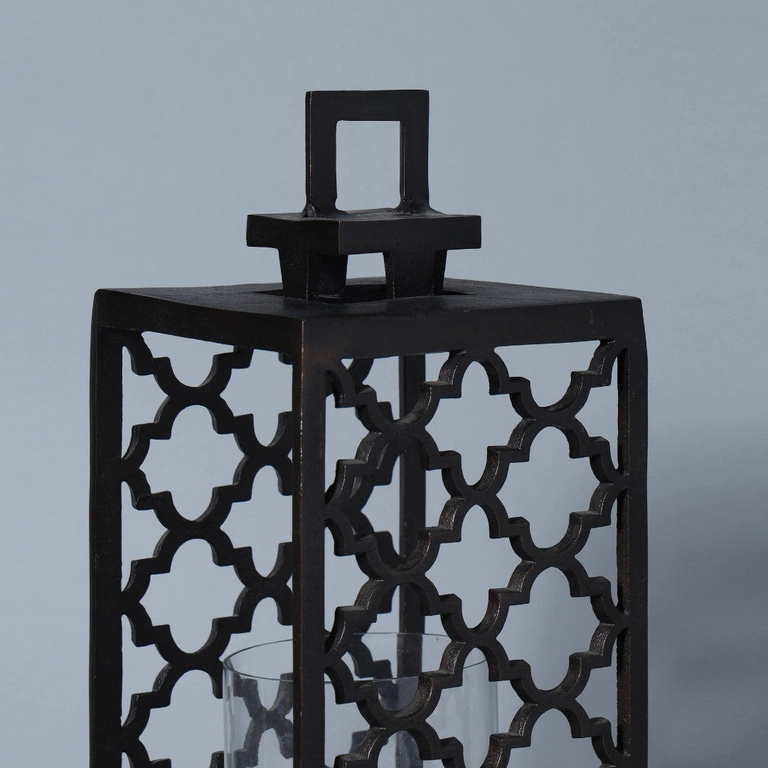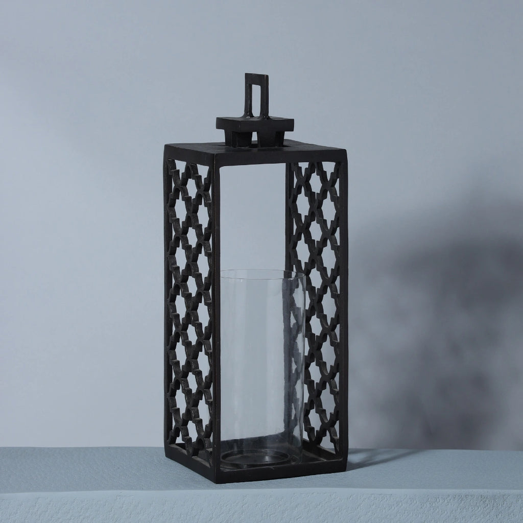 Eclipse lantern shines a light on fine woodworking. Lengths of responsibly sourced aluminium finished in black are skillfully assembled by hand into a ladder-like design that accents the edge and end corners. Reminiscent of Prairie School architecture, the glass-paned lantern illuminates outdoor spaces with clean lines and the natural beauty of brass. Pair with the matching large lantern for a multi-level display.
