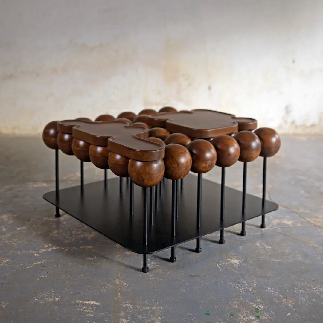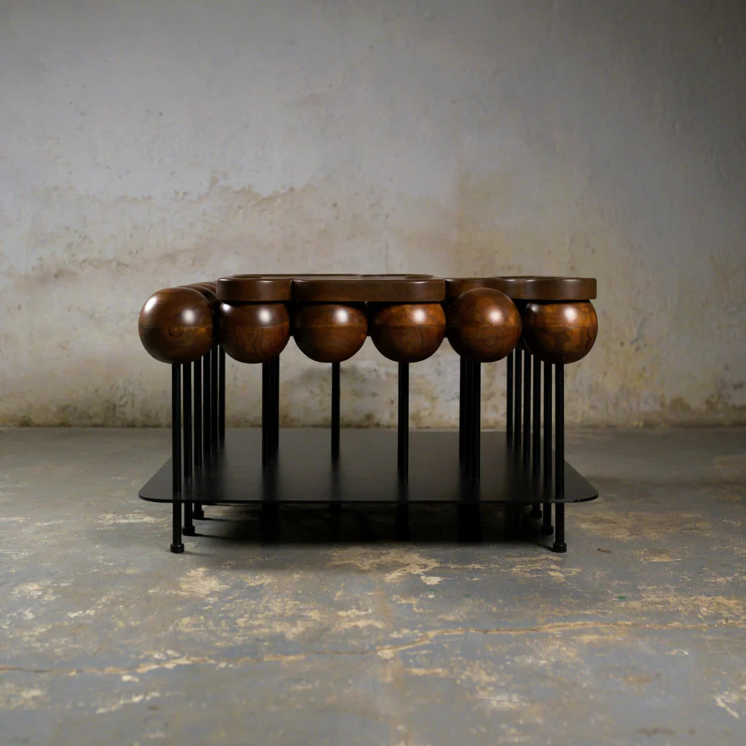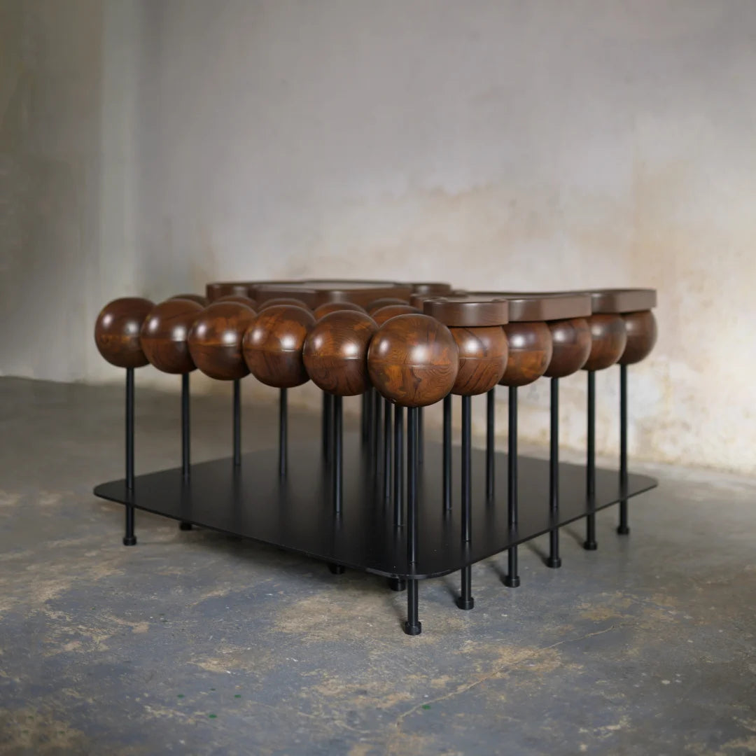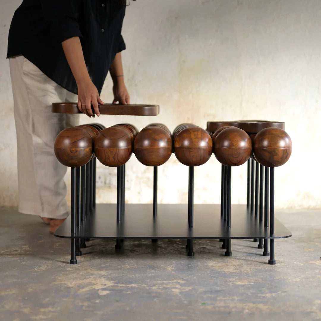The Sphera centre table stands on a sleek metal base, while reclaimed teak spheres form it's top. The Sphera makes a statement for any space it is placed in, while giving its user a playful and involved experience.
