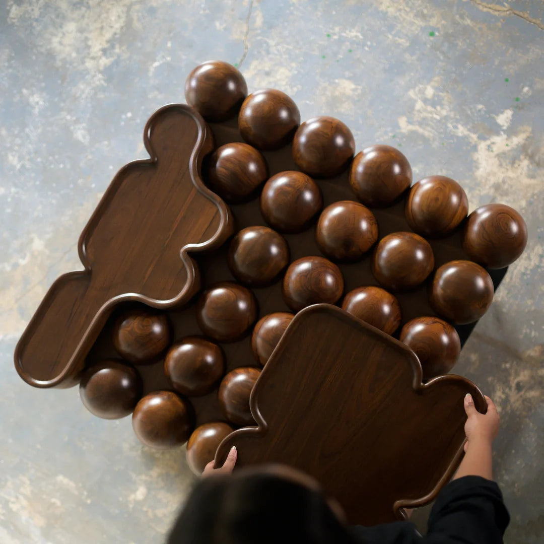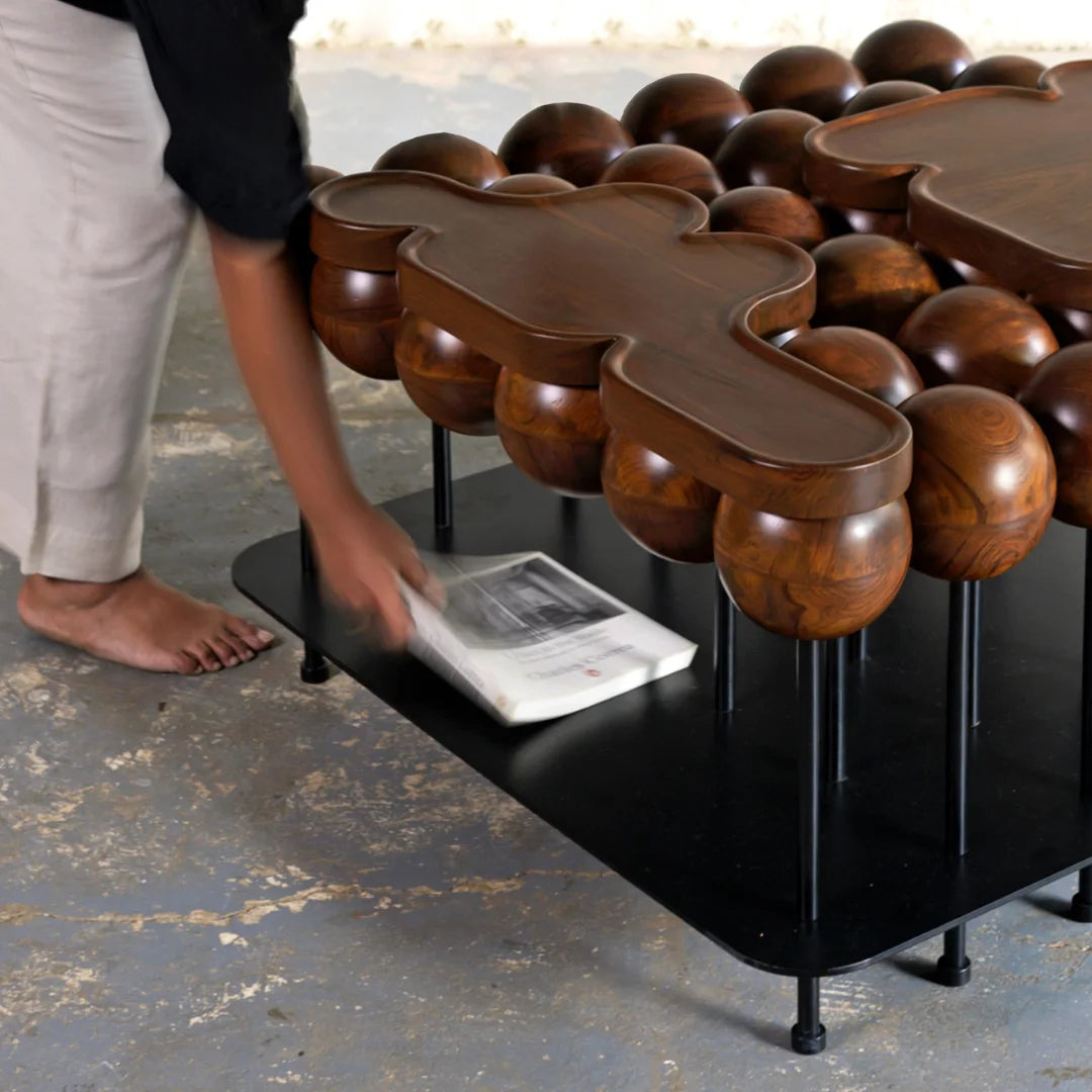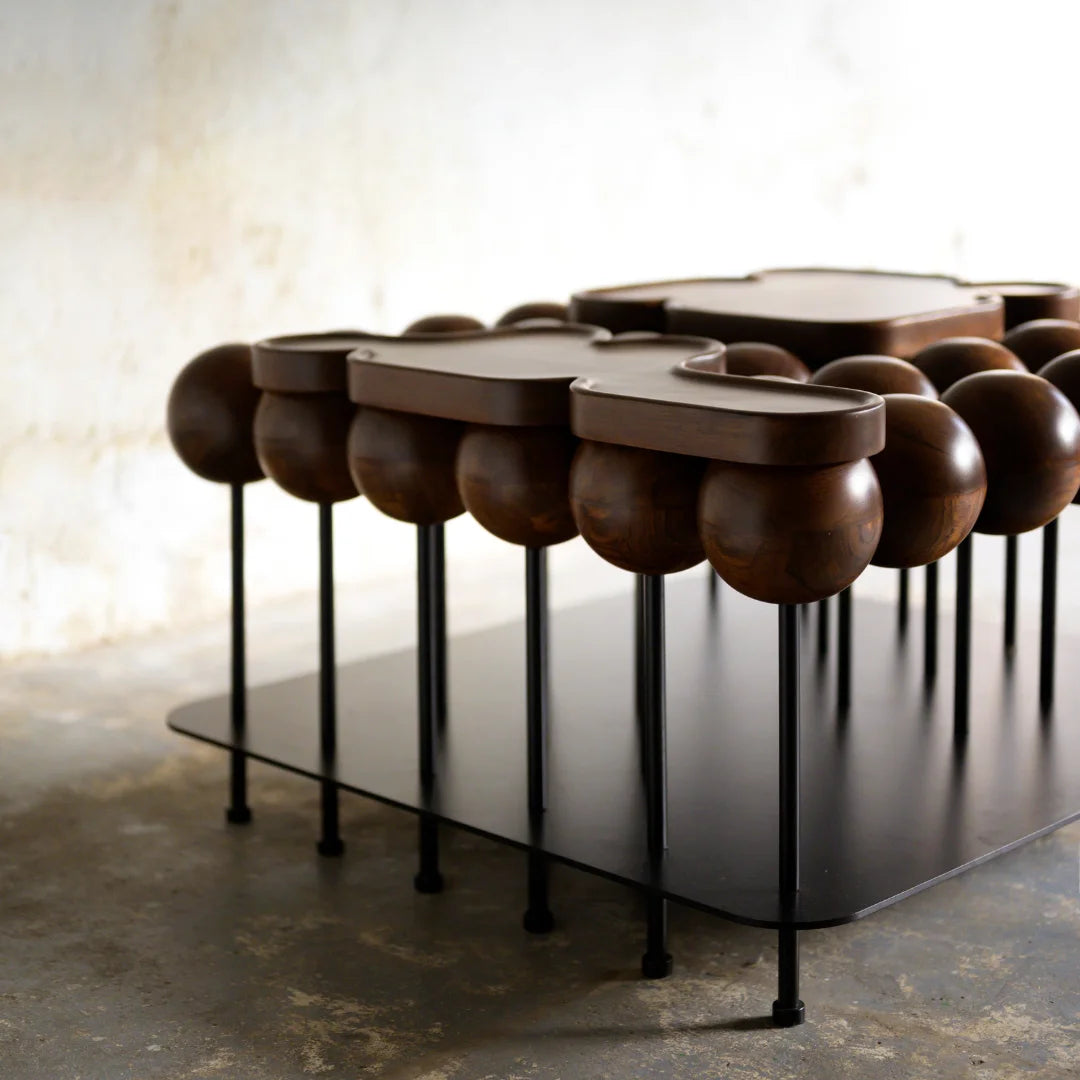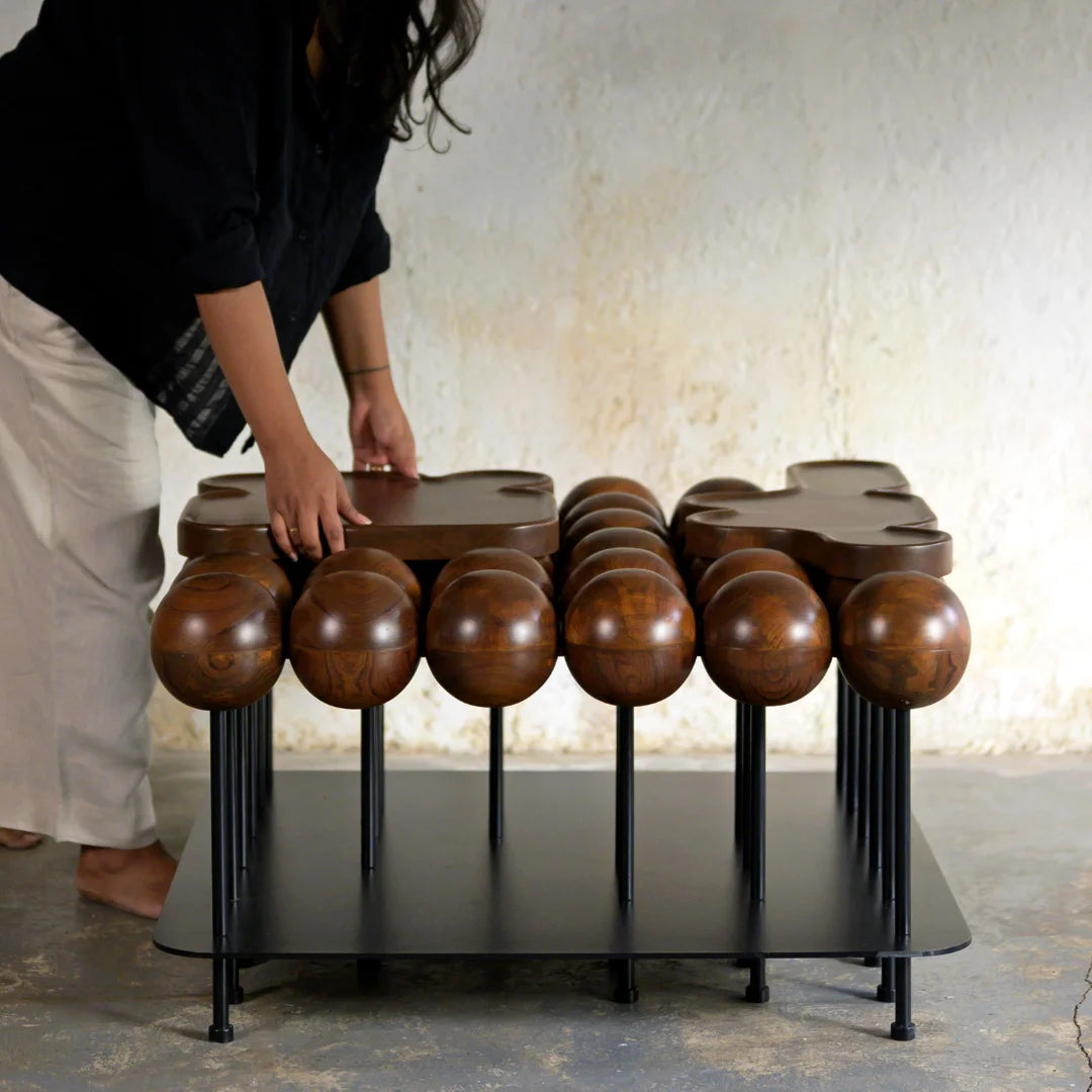 The Sphera centre table stands on a sleek metal base, while reclaimed teak spheres form it's top. The Sphera makes a statement for any space it is placed in, while giving its user a playful and involved experience.