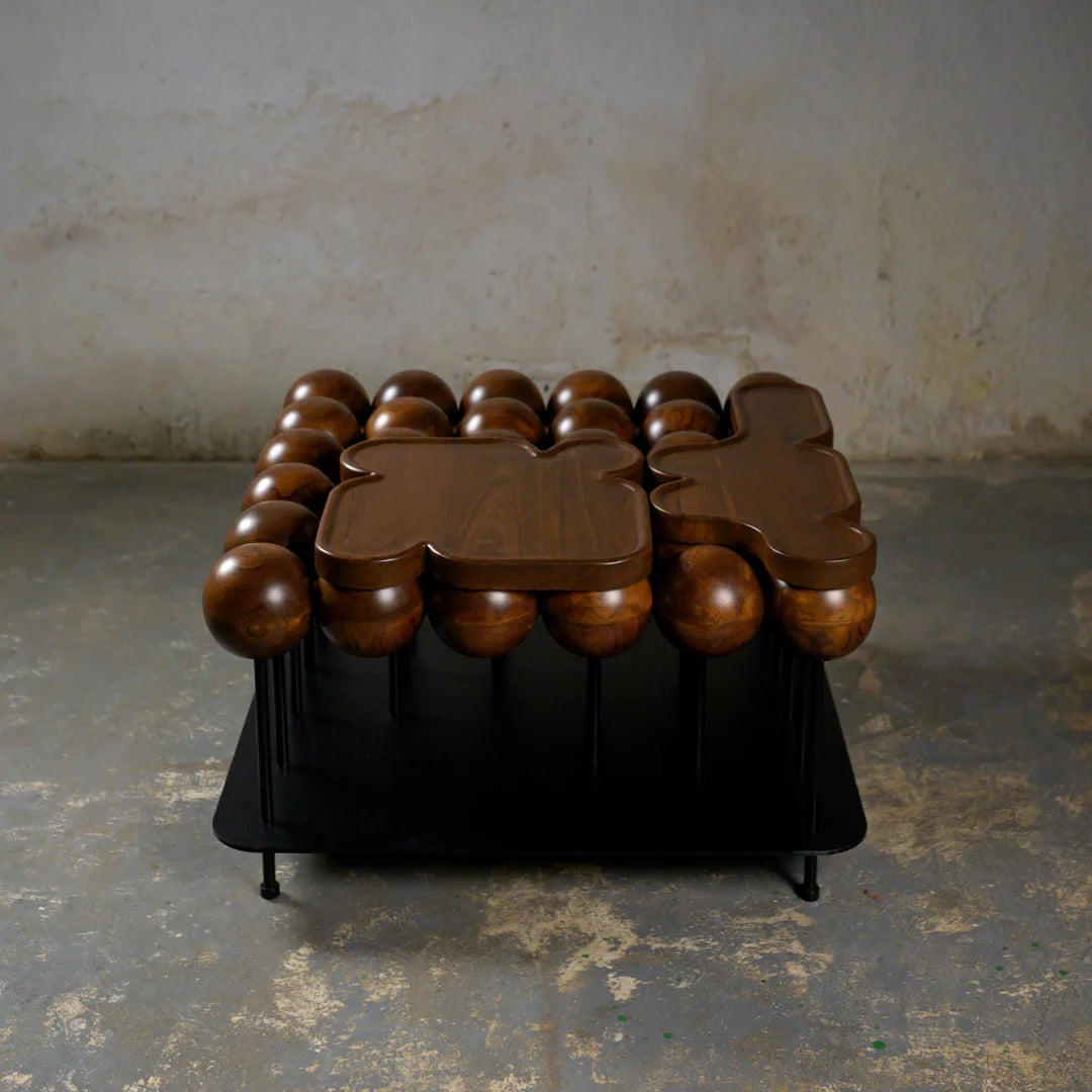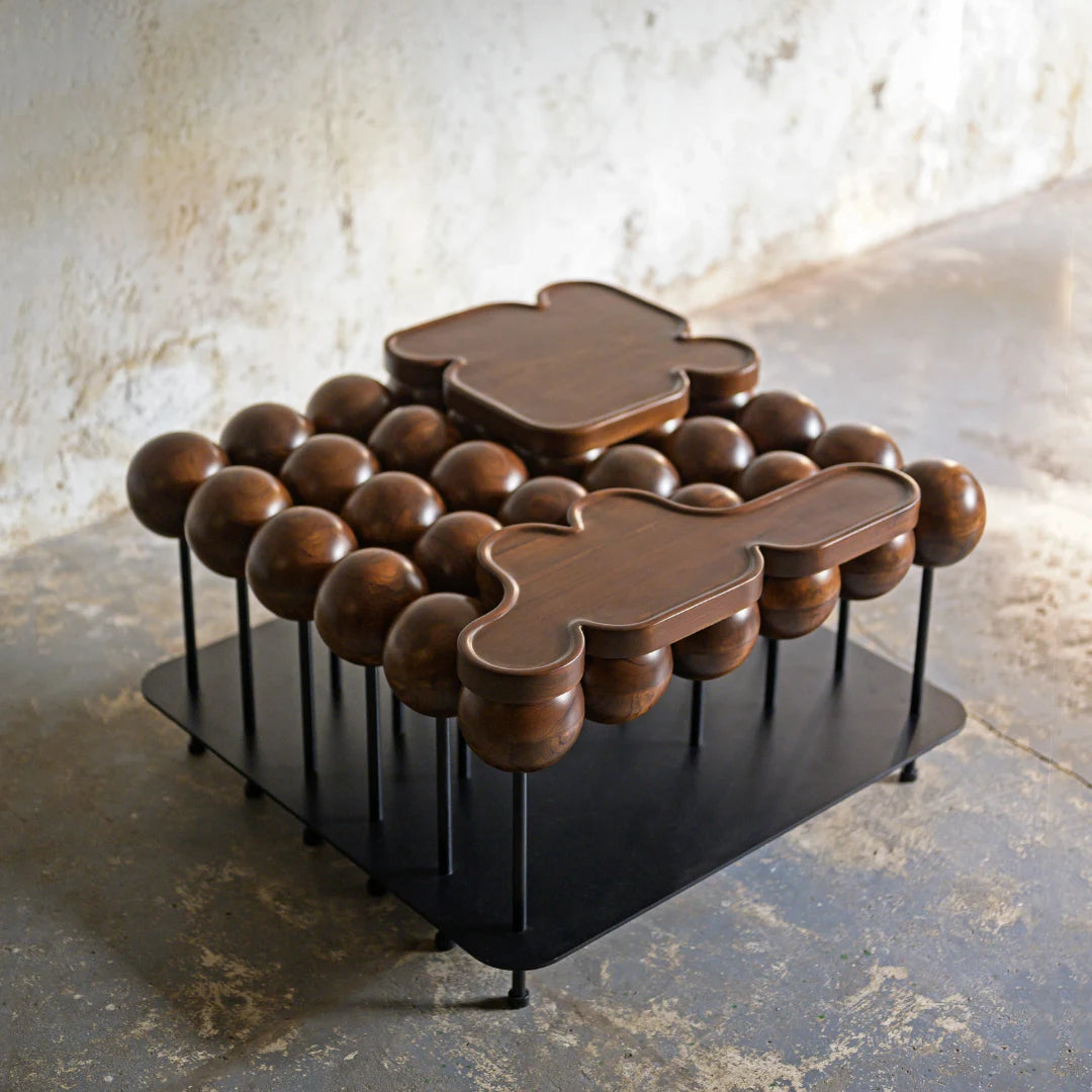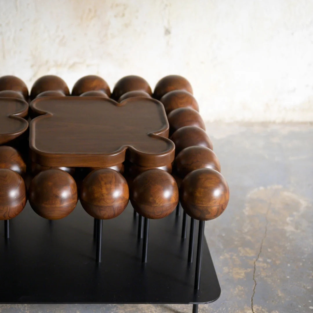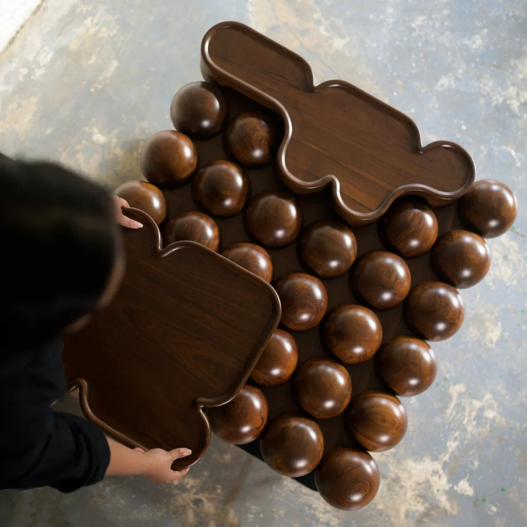 The Sphera centre table stands on a sleek metal base, while reclaimed teak spheres form it's top. The Sphera makes a statement for any space it is placed in, while giving its user a playful and involved experience.