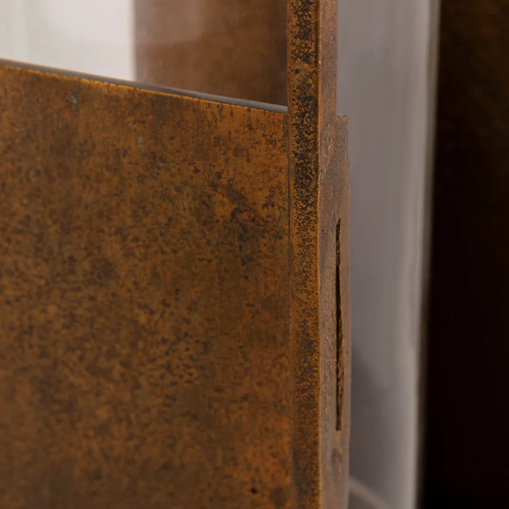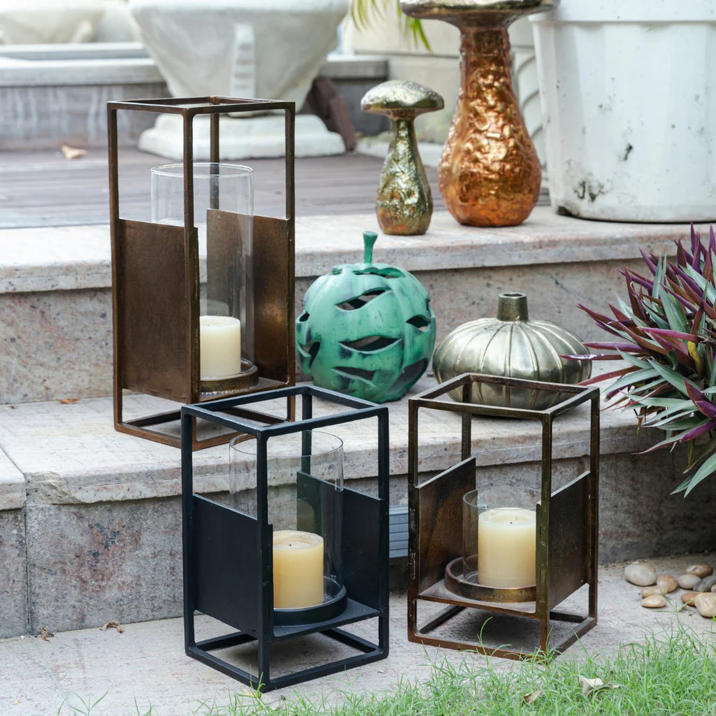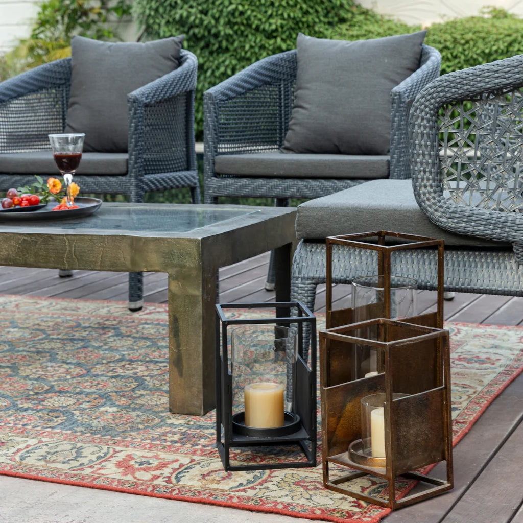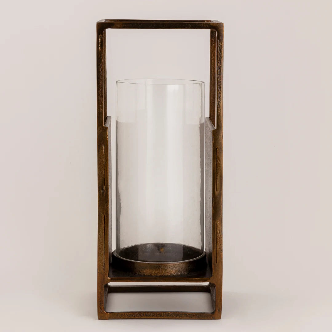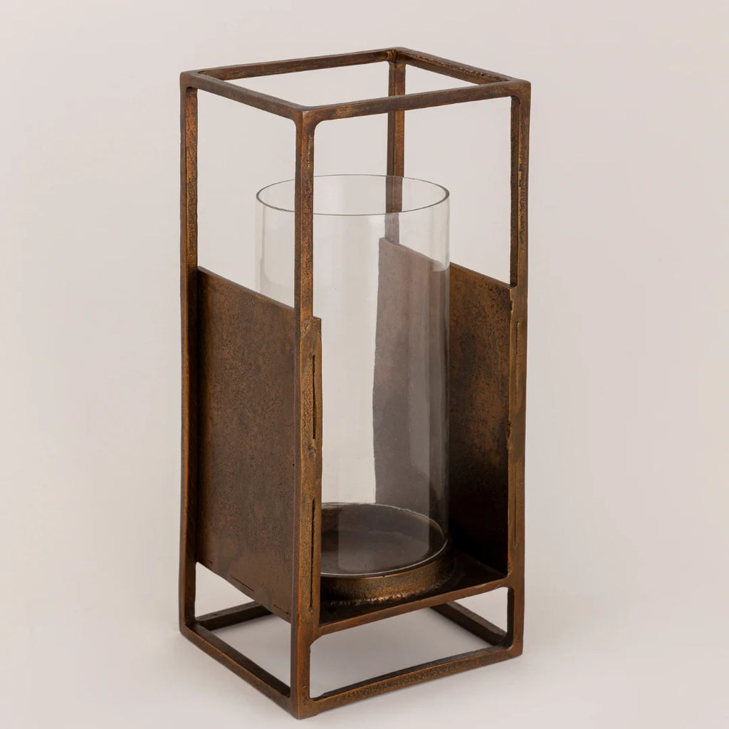 Our Vesta Lantern is a sophisticated edition to an entryway or staircase. This classic geometric lantern is handcrafted from   aluminium and gives a gold antique finish. The open, airy frame of this three dimensional  light brings depth and inspired lighting to any space-indoor or outdoor, while the open top ensures safe ventilation for the candle.