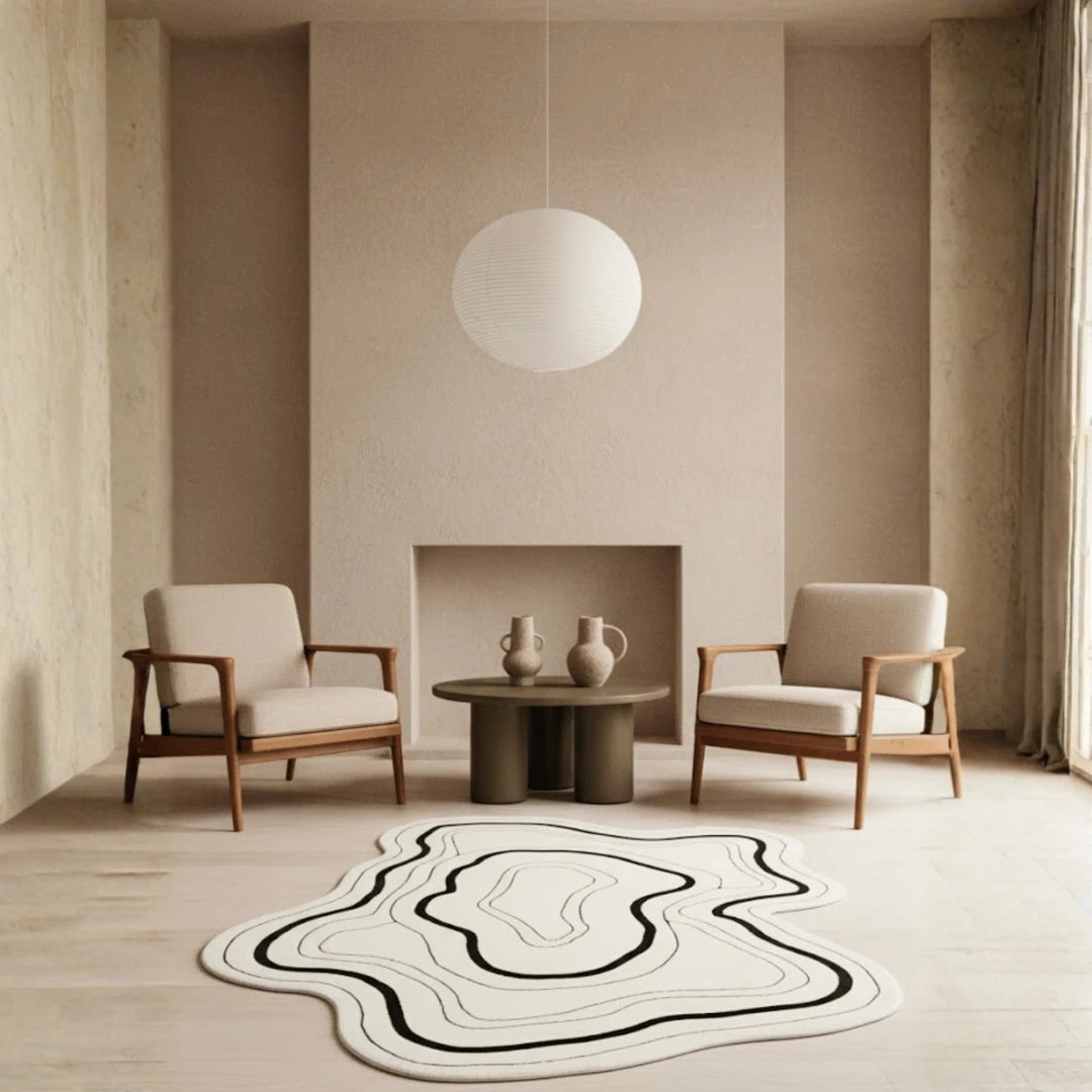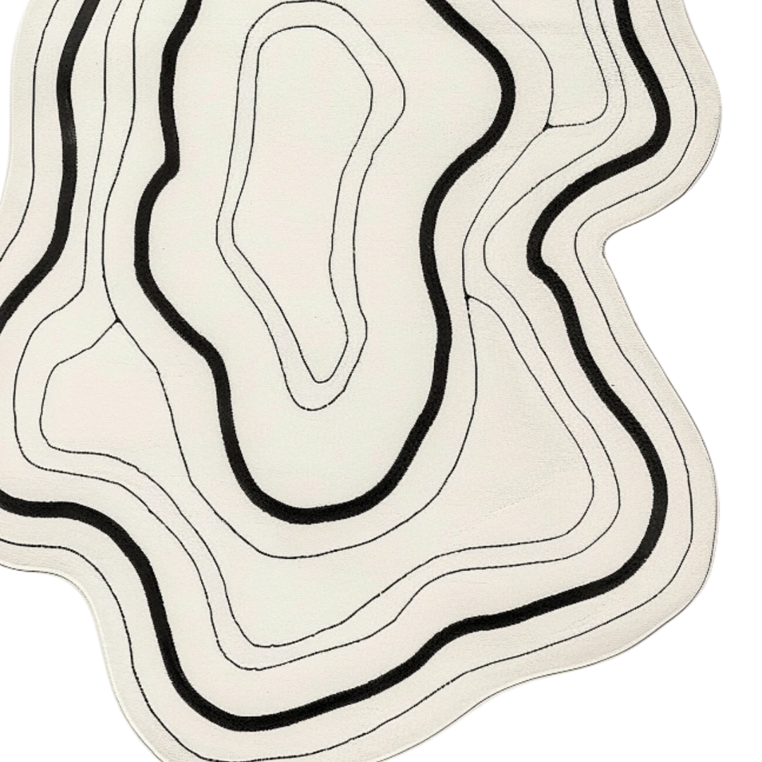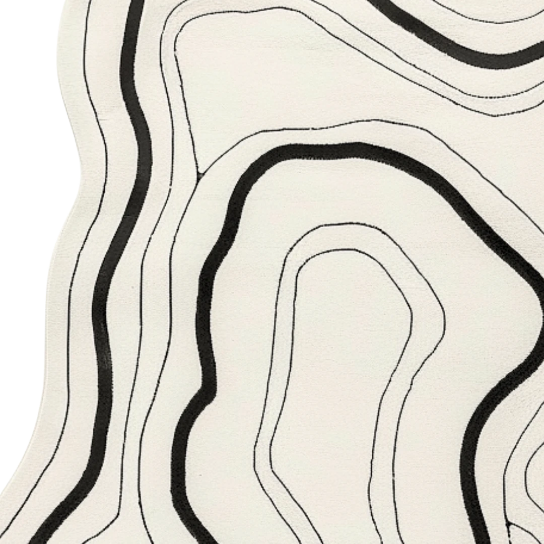 Crafted in a neutral palette of ivory and black, this rug anchors modern interiors with artistic calm and quiet strength. Each curve is precise yet organic, symbolizing the meeting of design and spontaneity — a true reflection of handmade elegance.
