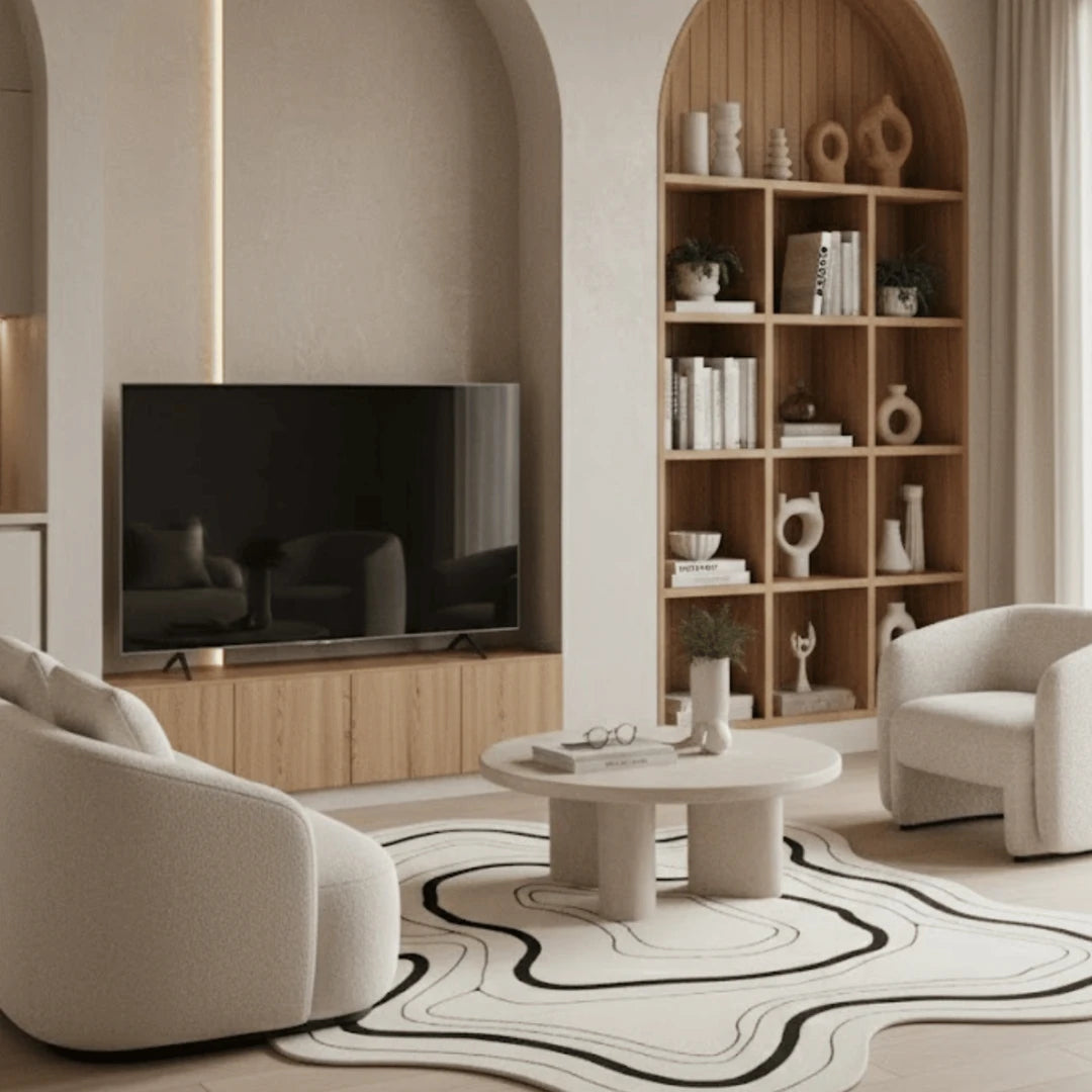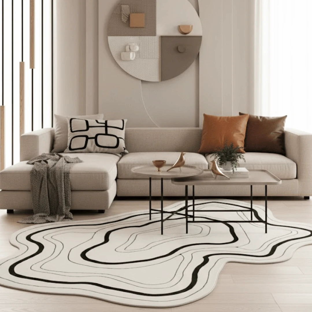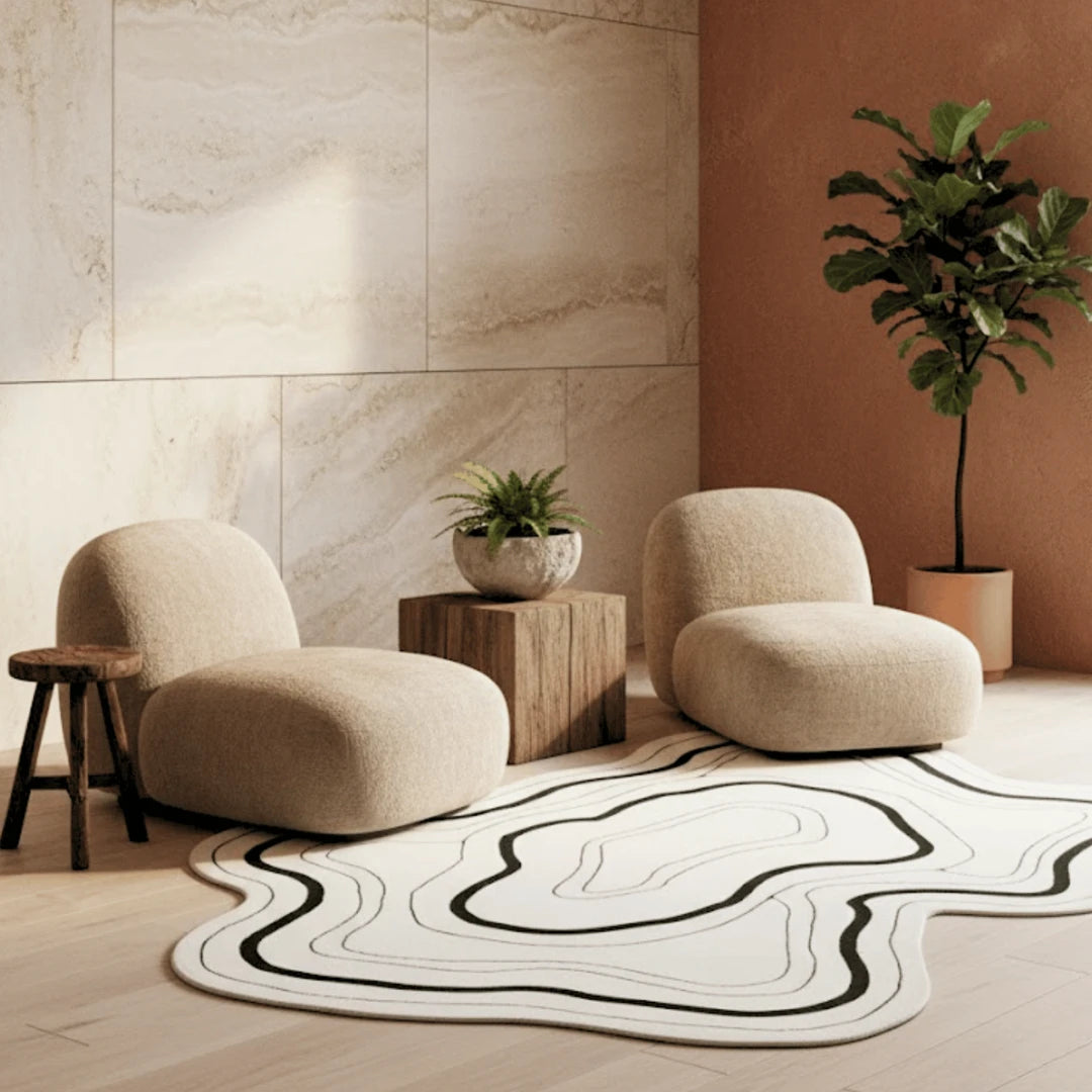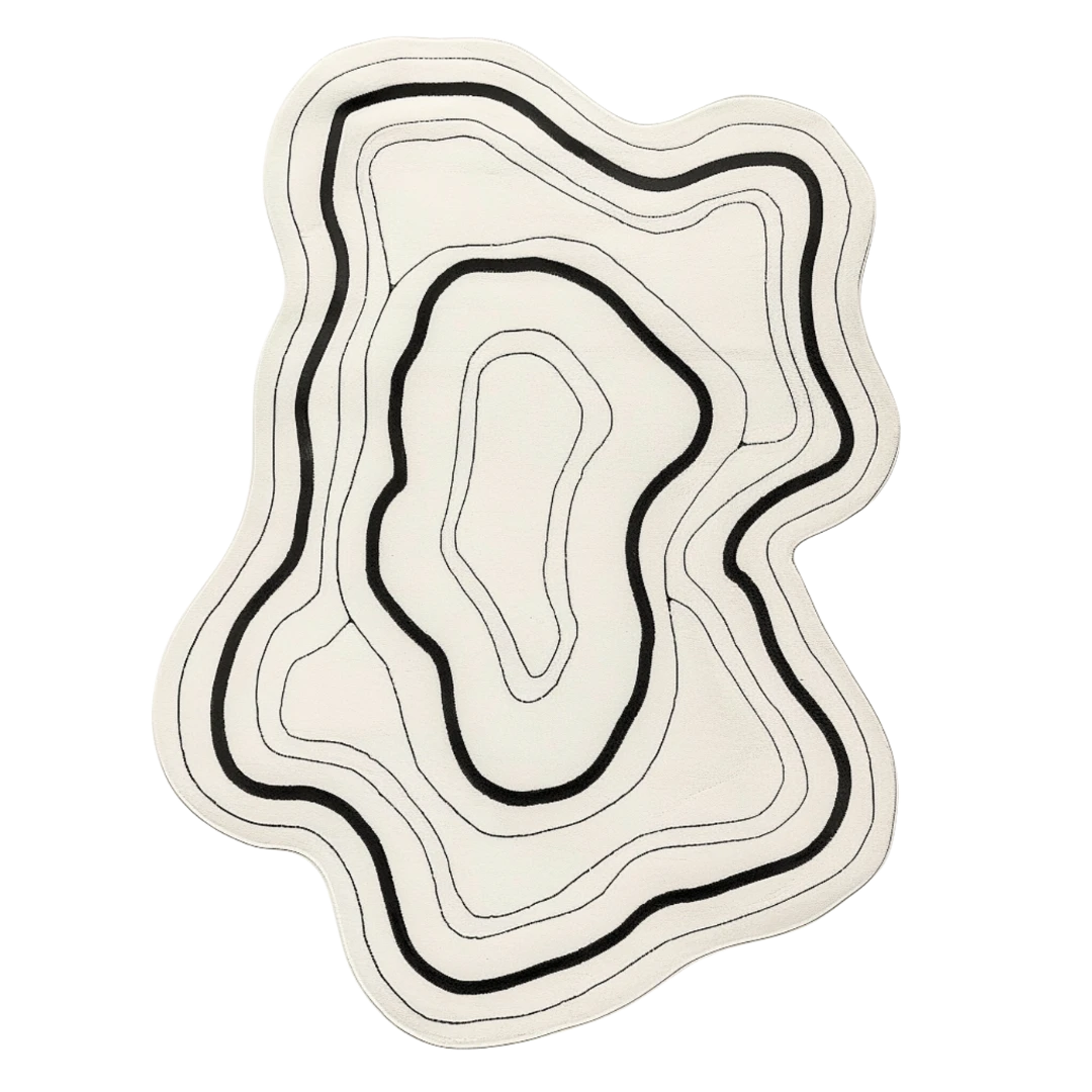 Crafted in a neutral palette of ivory and black, this rug anchors modern interiors with artistic calm and quiet strength. Each curve is precise yet organic, symbolizing the meeting of design and spontaneity — a true reflection of handmade elegance.